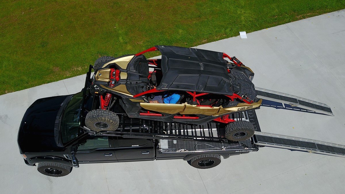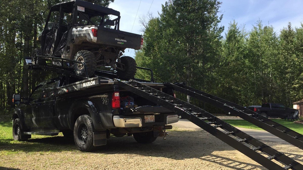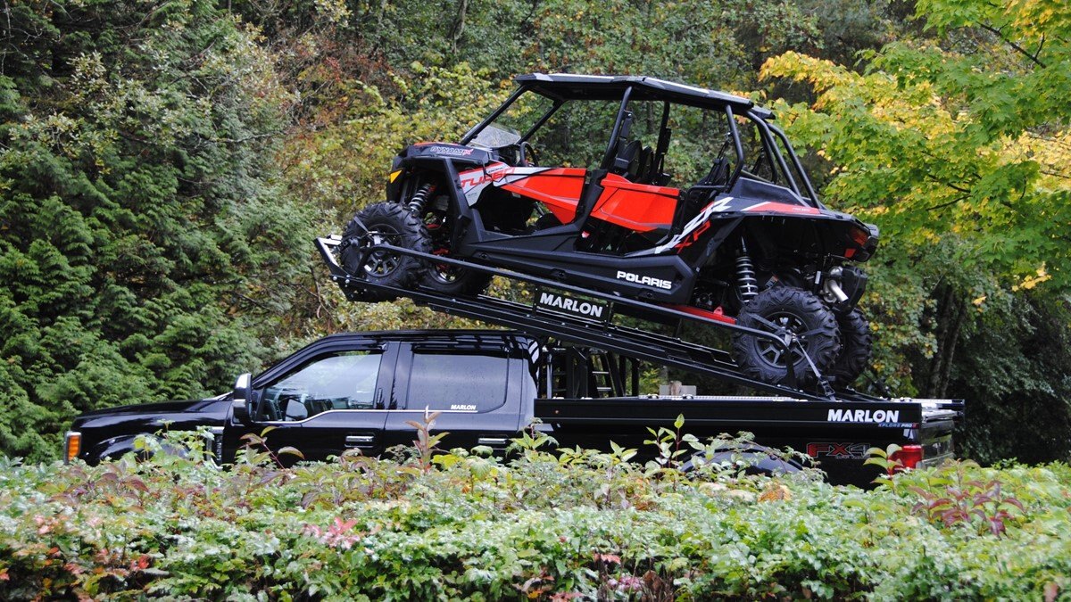 The Marlon Xplore II Riser takes your great Marlon snowmobile deck and transforms it into a great way to get your SxS out for some fun in the dirt and mud. Take your side by side camping, pull an enclosed trailer or pull your boat the choice is now yours! We have all of the side by side machines currently on the market today covered. As a standard configuration the Riser was designed to carry 2 and 4 door side by sides up to 120” max length. With the addition of the Riser Extension you can go to a maximum length of 165”s. Whether your side by side is 50”s wide or 76”s wide the Marlon Riser has you covered! The riser is standard with a number of features our SxS deck is famous for. Features like the positive park front tire cradles, Marlon’s unique tire tie down system, Marlon’s traction grips, side safety loading bars, winch plate or securement point to use your side by side winch to pull your machine on if need be. The 2018 Marlon snowmobile decks come with a new telescoping snowmobile ramp that has been designed with new extrusions to incorporate the wide superglides for the wider snowmobile stances and the 50” wide side by sides. For the larger machines we have optional 10’ or 12’ single folding ramps the choice is yours. Get your riser and go Xplore!