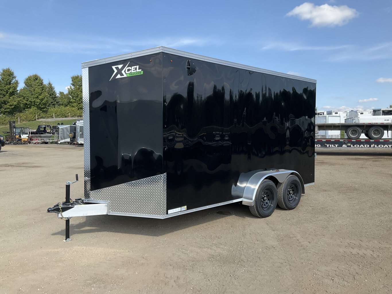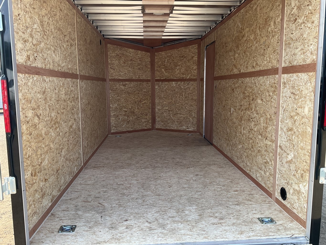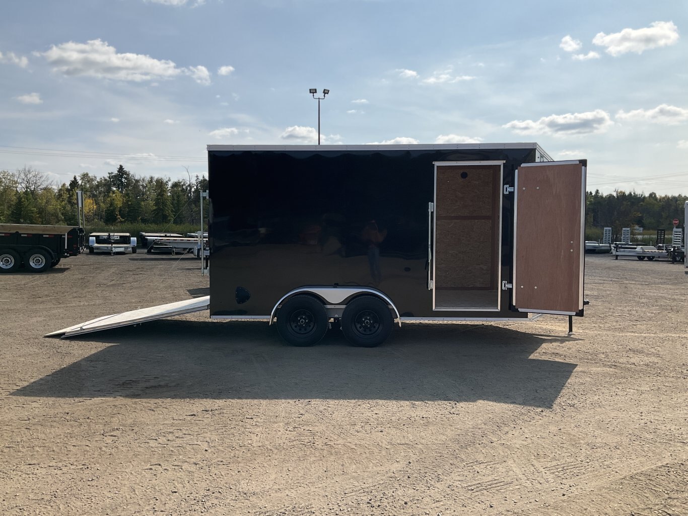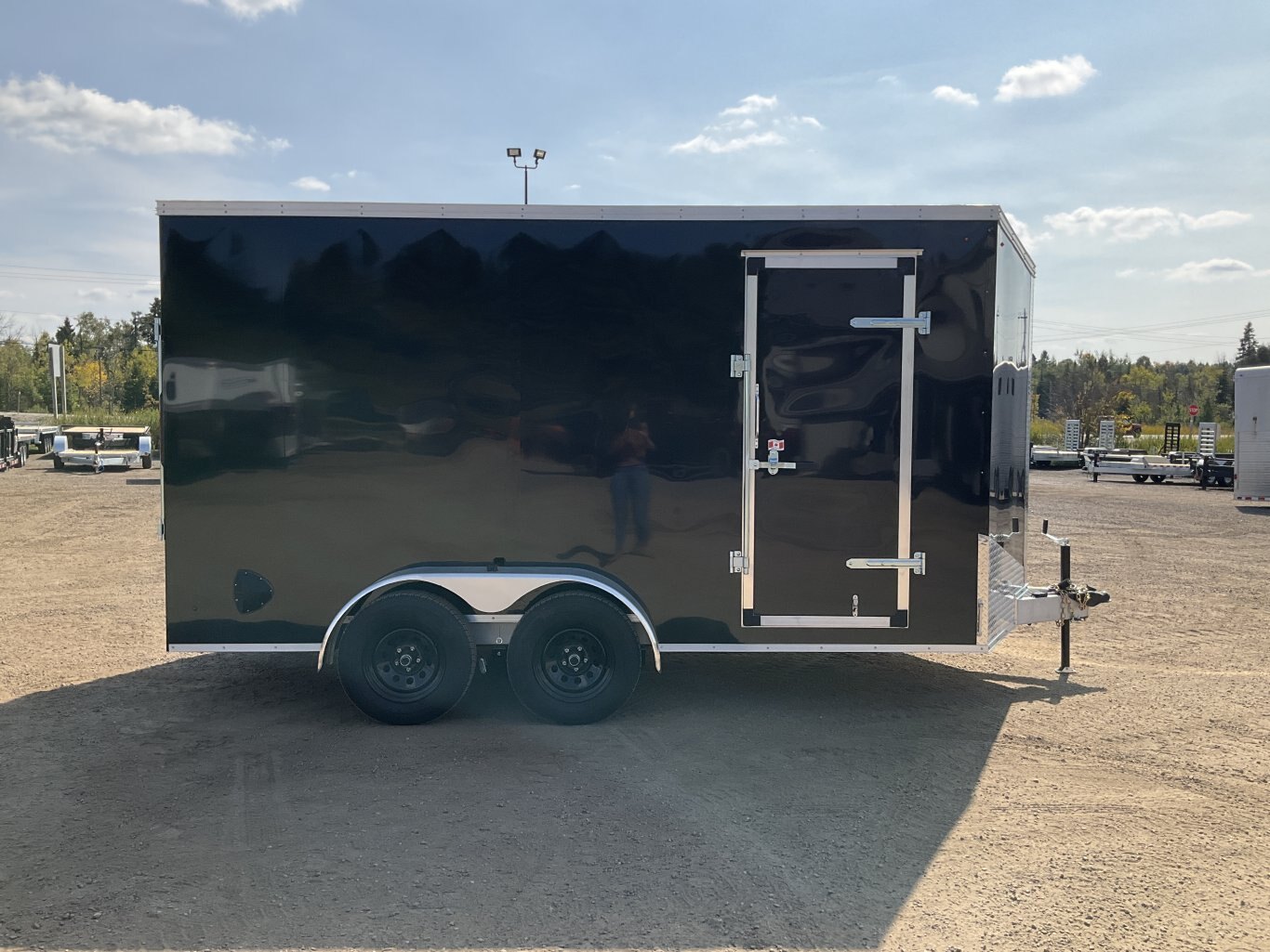 7000LB GVWR, 2 3500LB Spring Drop Axles with EZ Lube Hubs, Electric Brakes on Both Axles, 15" Radial Tires, 2' Sloped V-Nose, 7' Tall, .030 Black Screwless Exterior, 32" Side Man Door, Rear Ramp Door with Spring Assist, 3/8" Wood Lined Walls, 3/4" Rainblock Wood Floor, Seamless Aluminum Roof, 16" On Centre Walls/Floor/Roof, 2 Wall Vents, 12V Dome Light with Switch, 4 HD Tie Down Rings, ATP Stone Guard, 2-5/16 Ball Coupler, A-Frame Tongue Jack with Sand Pad, Sealed LED Lighting