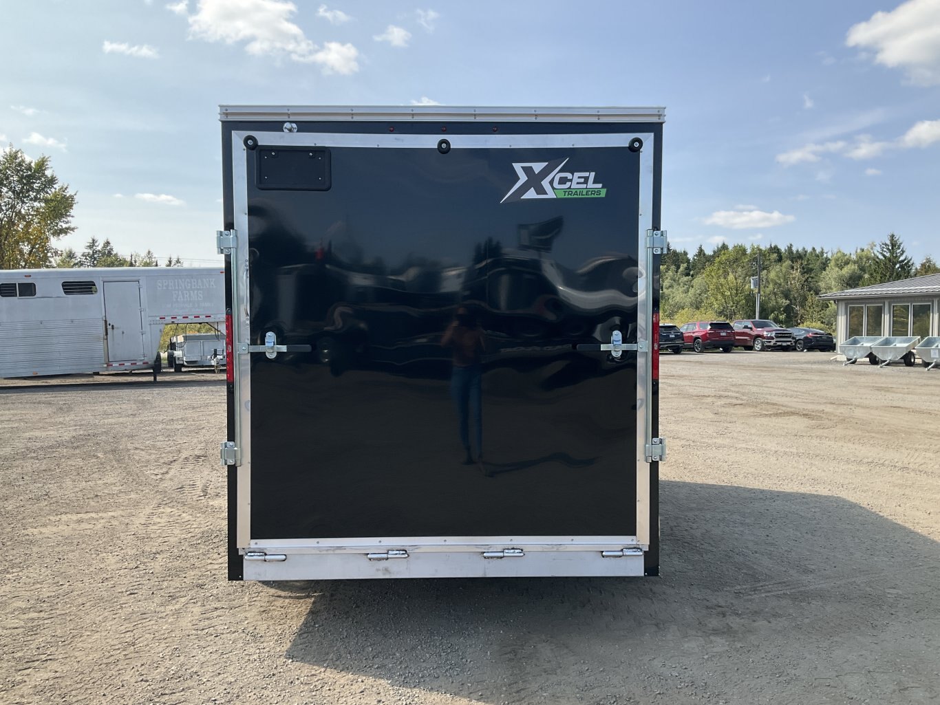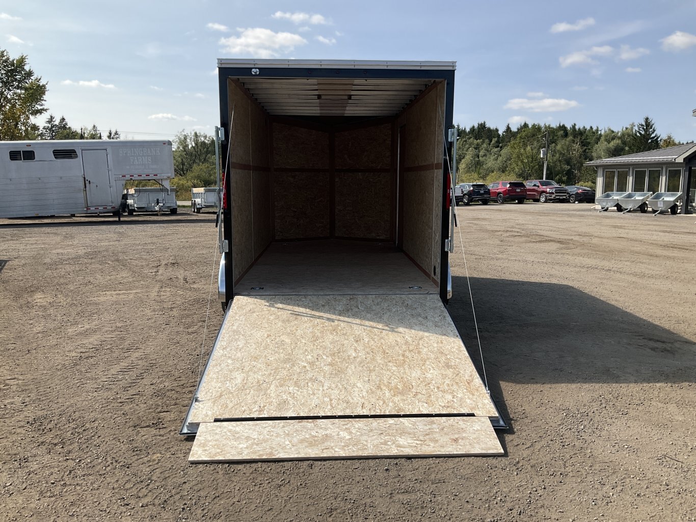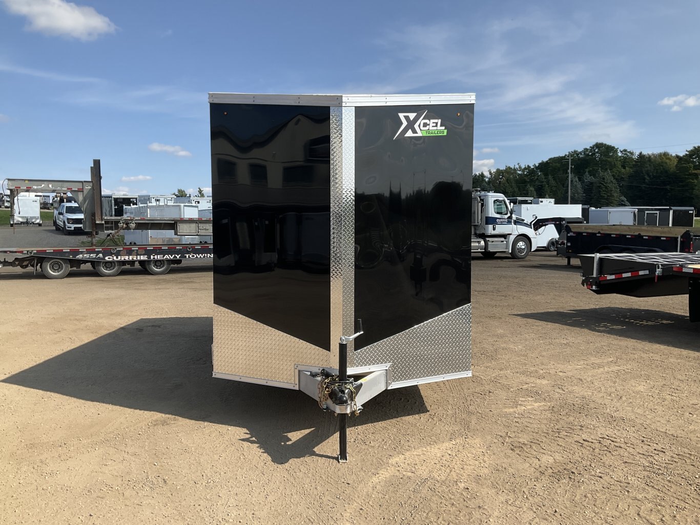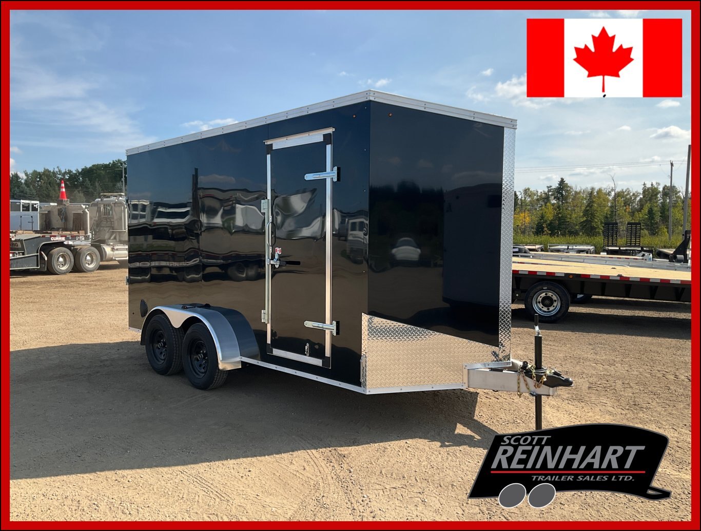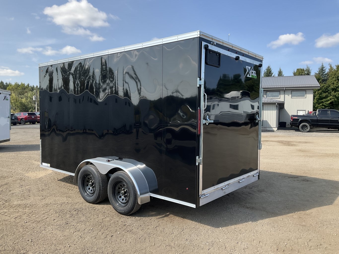 7000LB GVWR, 2 3500LB Spring Drop Axles with EZ Lube Hubs, Electric Brakes on Both Axles, 15" Radial Tires, 2' Sloped V-Nose, 7' Tall, .030 Black Screwless Exterior, 32" Side Man Door, Rear Ramp Door with Spring Assist, 3/8" Wood Lined Walls, 3/4" Rainblock Wood Floor, Seamless Aluminum Roof, 16" On Centre Walls/Floor/Roof, 2 Wall Vents, 12V Dome Light with Switch, 4 HD Tie Down Rings, ATP Stone Guard, 2-5/16 Ball Coupler, A-Frame Tongue Jack with Sand Pad, Sealed LED Lighting