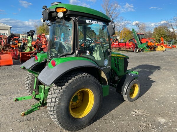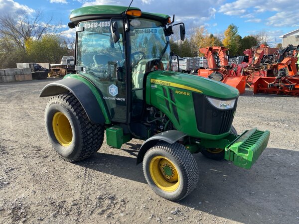 Externalspecs: 2020 John Deere 4066R 65hp Tractor with cab,\nfront weights, front fenders, extended rear fenders,\nturf tires, 3pt accumulator, two rear valves, external\n3pt controller, 835hrs