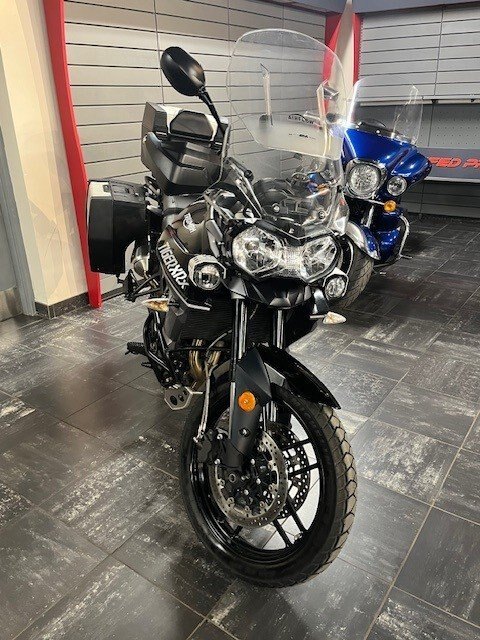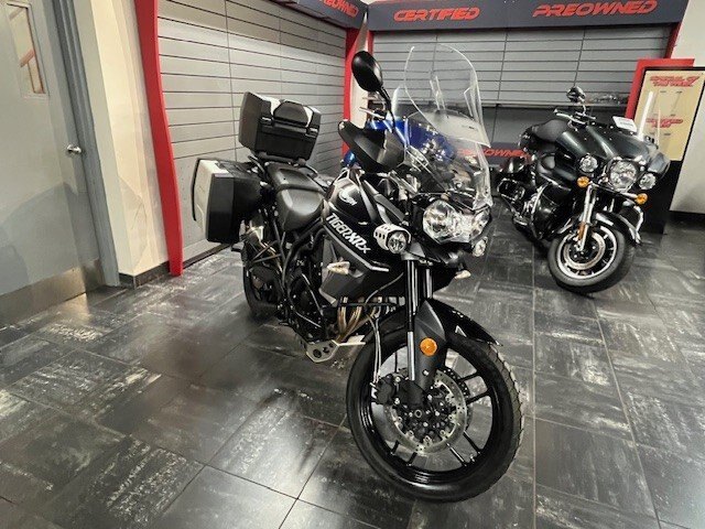 The 2015 Triumph Tiger 800 XRx is a road-biased adventure motorcycle with a 799cc three-cylinder engine, a fly-by-wire throttle, and standard electronic rider aids like cruise control, ABS, and traction control. This second-generation model improved on its predecessor with a claimed 17% better fuel economy and enhanced performance. Key features include cast alloy wheels, a comfortable and adjustable windshield, and a cockpit with a digital display, making it well-suited for long-distance touring and general road use.