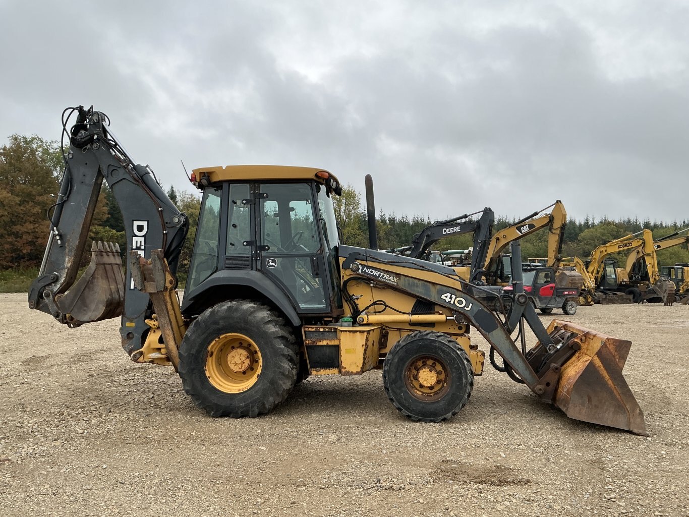 2010 John Deere 410J is powered by a 98hp John Deere diesel engine. Unit is equipped with front hydraulic quick connect. Enclosed heated cab with all glass intact and a c. 4 wheel drive with 4 speed transmission. Unit is extendahoe with pilot controls. Machine is equipped with rear auxiliary hydraulics with manual pin coupler. Operating weight is about 20,500lbs. Hour meter reads 15226.