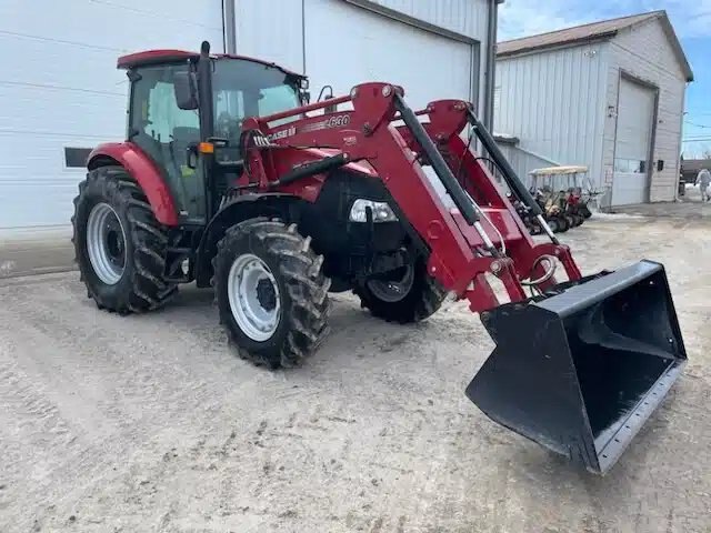 Deluxe Cab Air ride seat. Handbrake front fenders. 4x110 lb wheel weights with Mid Mt Valve with 3rd function Case IH HD L630 Self leveling loader. Hydraulic Bucket coupler 84" bucket. 2 speed transmission with Power shuttle. 2 remotes. Three point top link. Front Tires 12.4x24. Rear Tires 18.4x30. No duals.