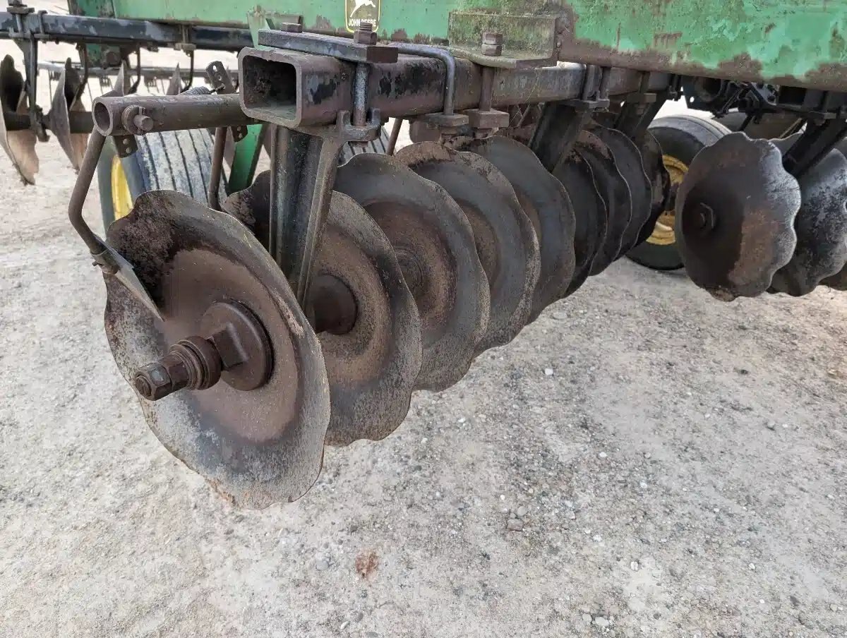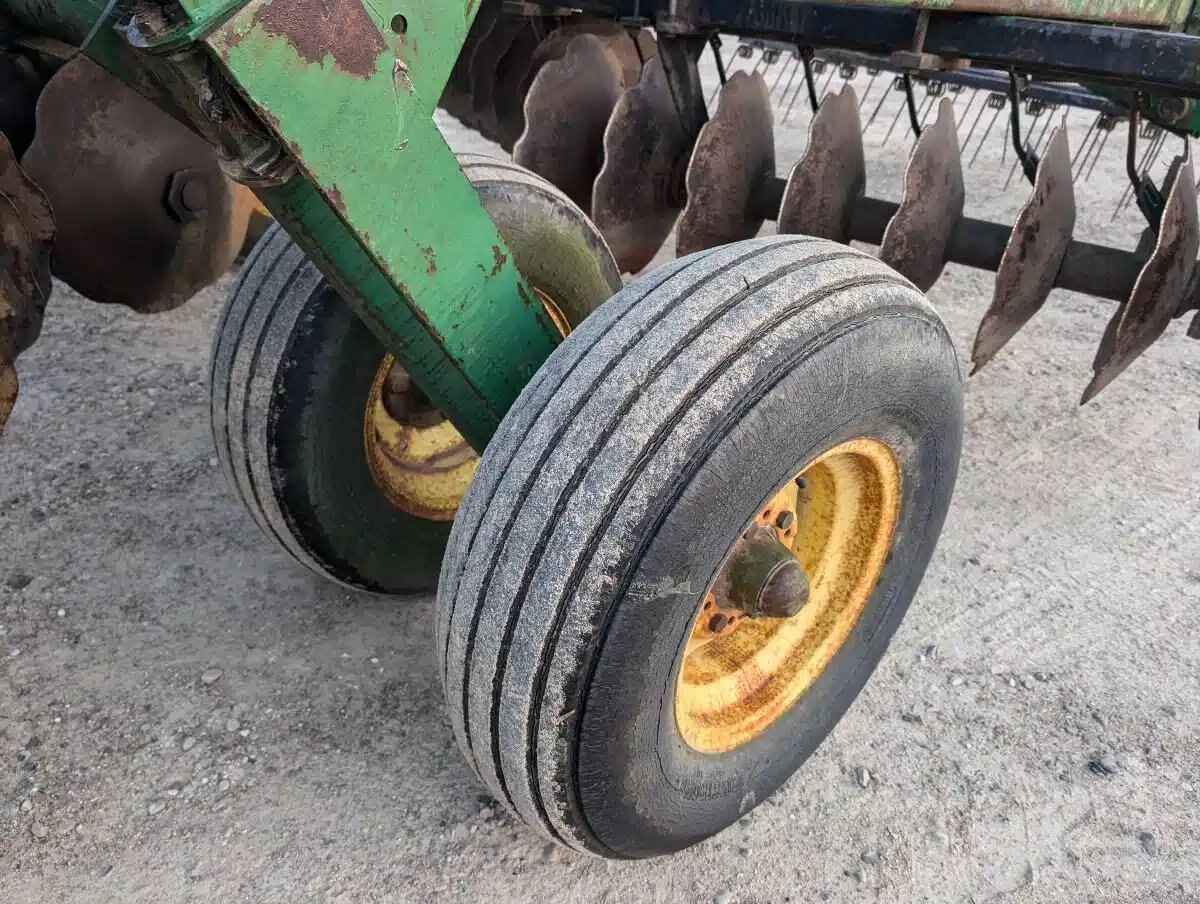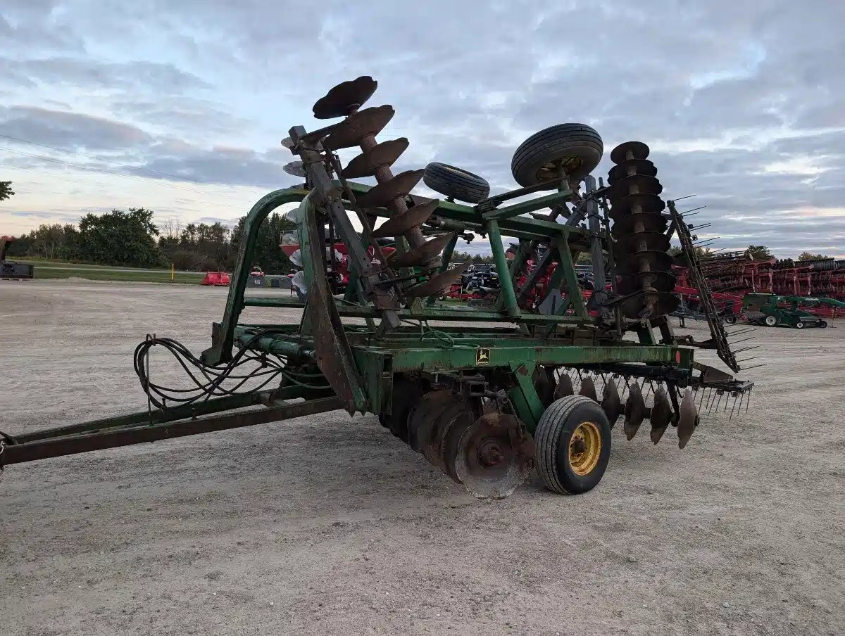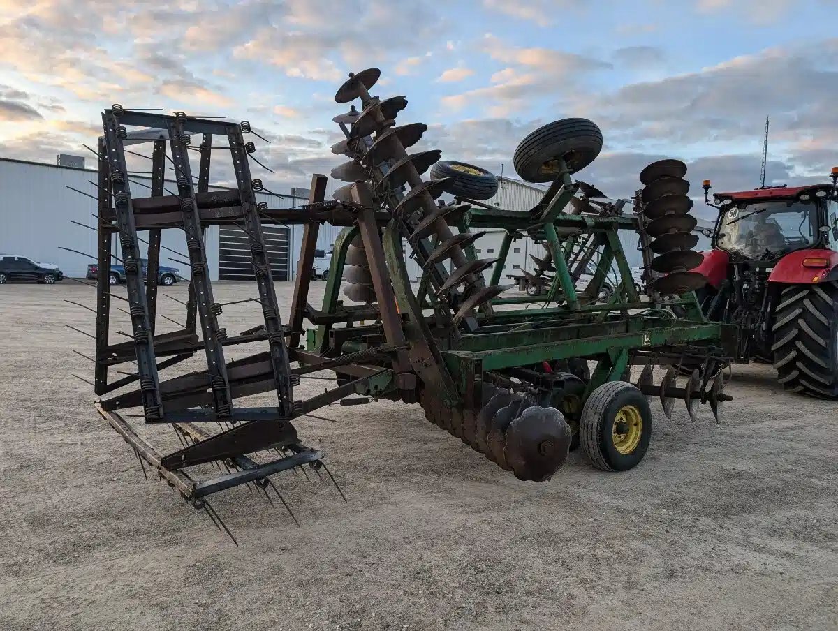 John Deere 230 Disc Harrow. 24ft Single Fold 3 Section Unit w/ Front & Rear Knotched Disc, 3 Bar Spring Tine Harrows and Rides On 11L-15 Tires.