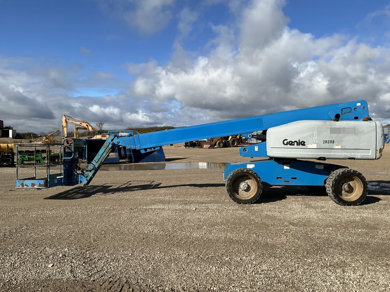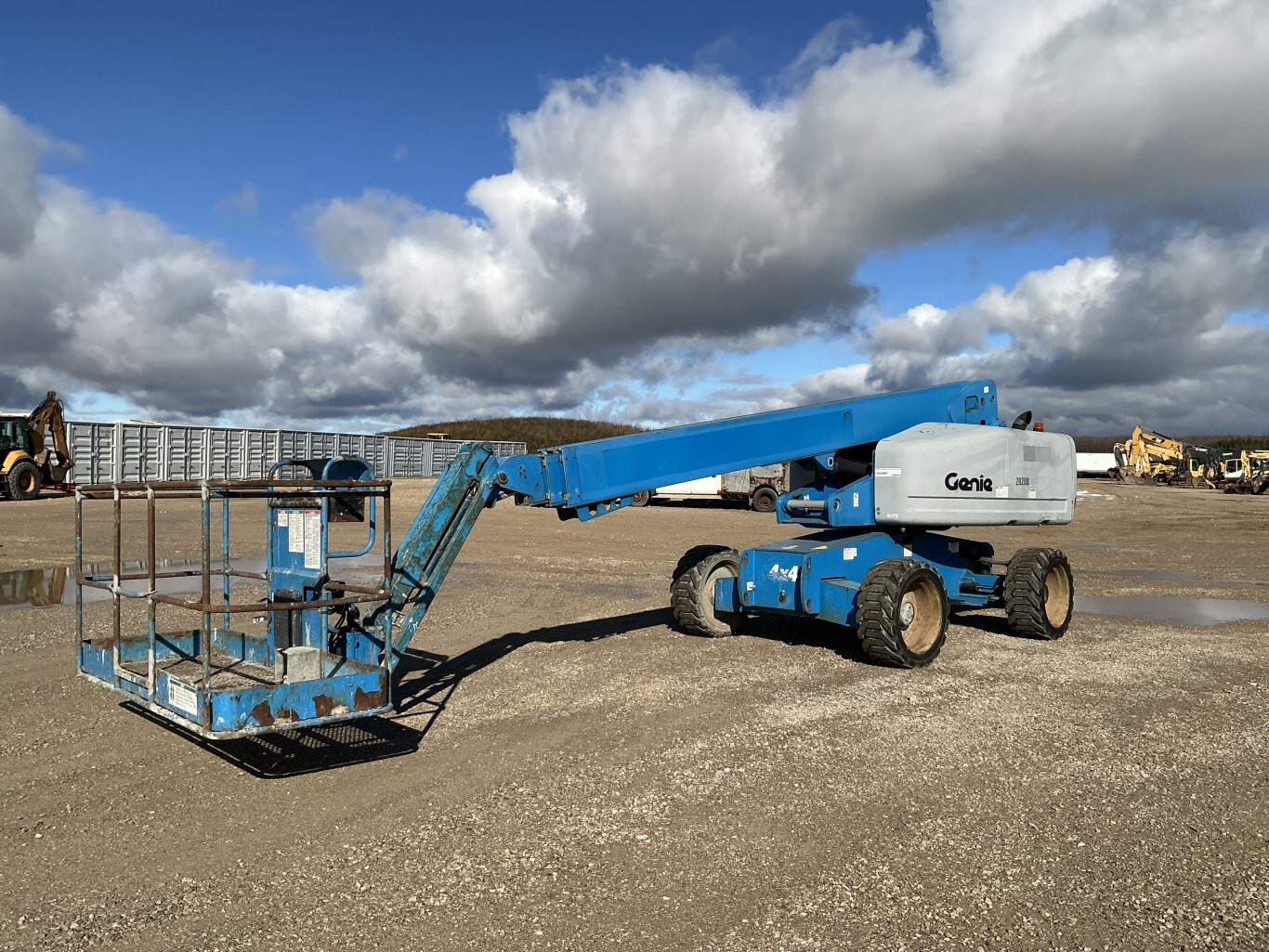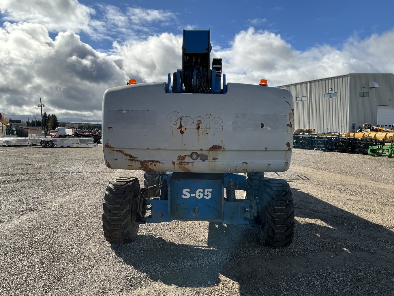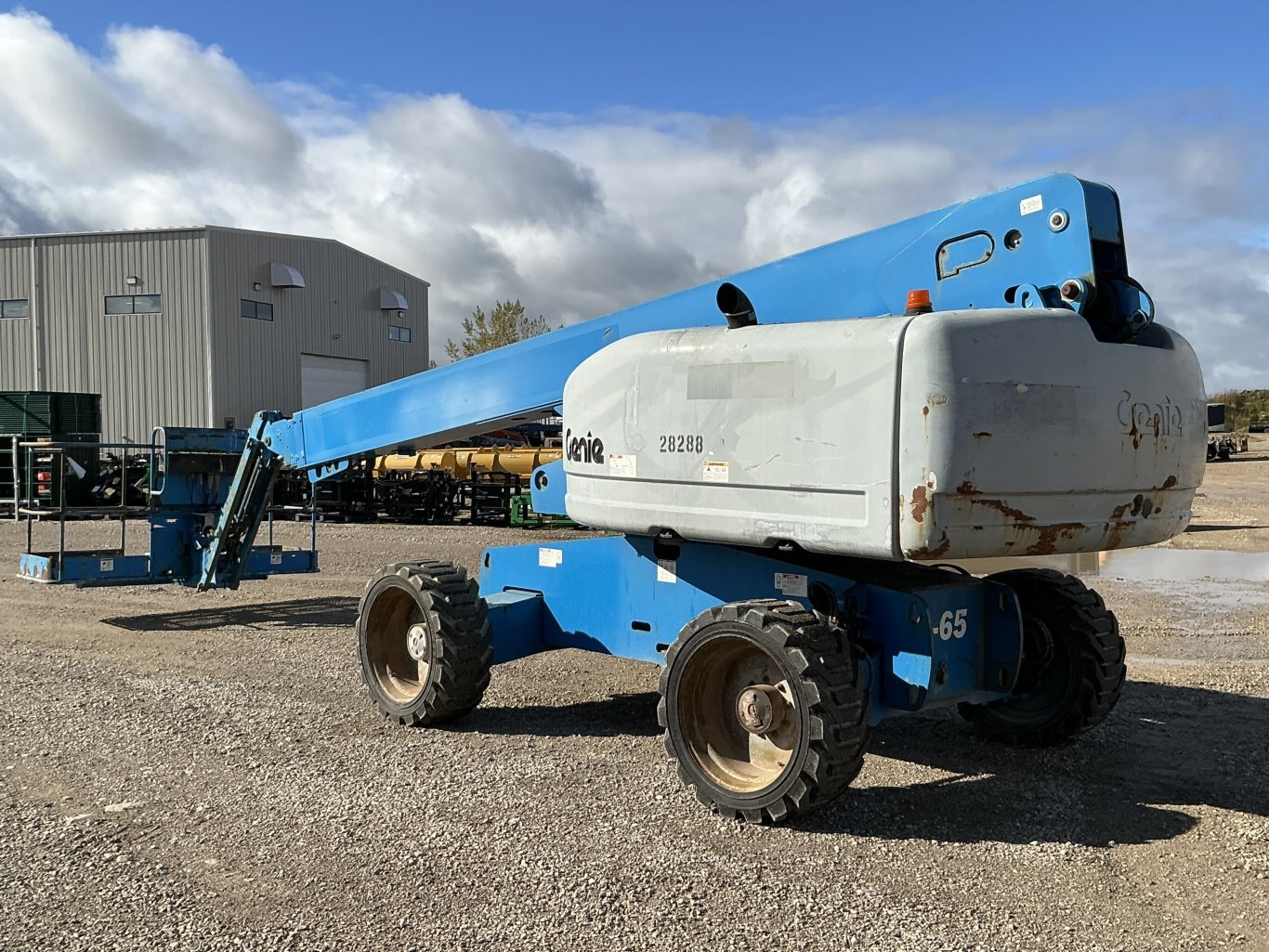 2012 Genie S-65 straight boom with jib. This boom lift has a platform height of 65 feet giving 71 feet working height and 56 feet outreach. 4WD driveline and powered by a Perkins diesel engine. Machine weighs around 23,000 lbs. Hour meter shows 4418.