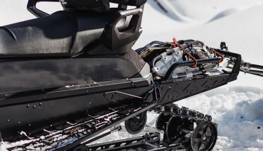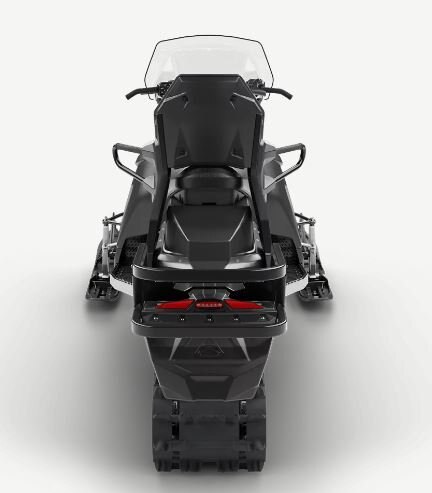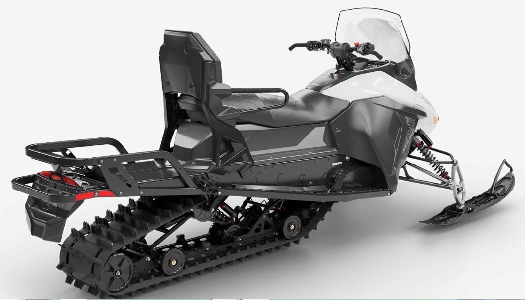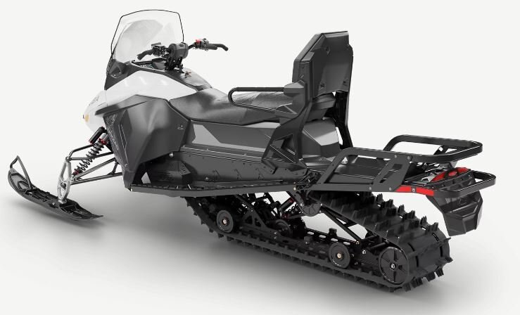 Wide-stance utility snowmobile with heated grips, windshield, 2-up seating with passenger backrest and handholds, cargo rack, and dual-coilover type suspension.