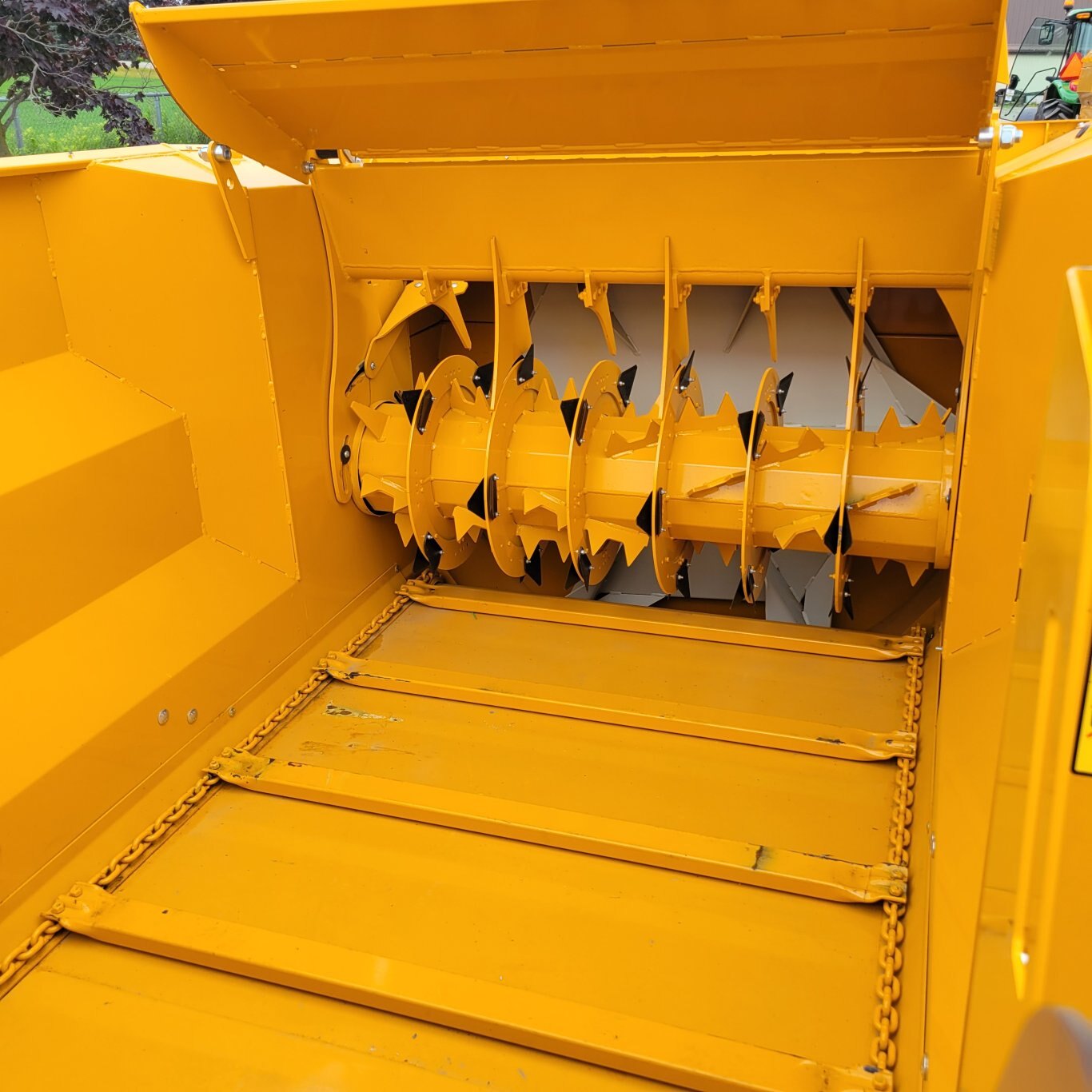 This Bale Spreader is equipped with 1 mechanical shredder and can distribute all types of material, corn silage/straw/grass/alfalfa regardless of size of strand (long or short) and the degree of moisture. - Lateral Chute for feeding and straw blowing - mechanical shredder with V blades - hydraulic comb - two speed gearbox - hydraulic loading rear door - electronic controls