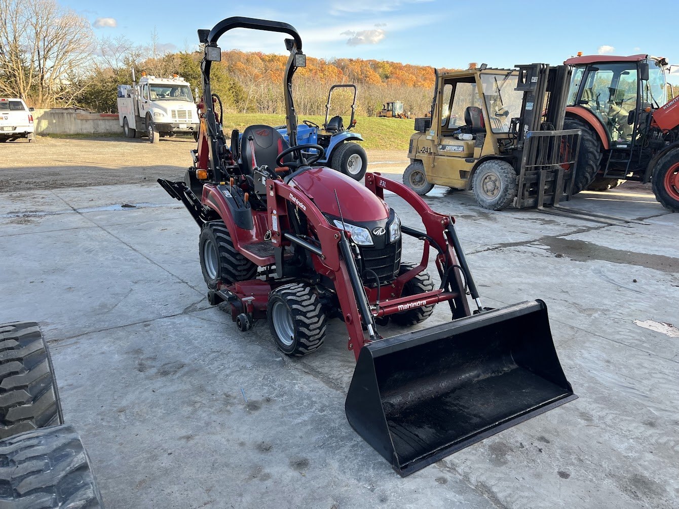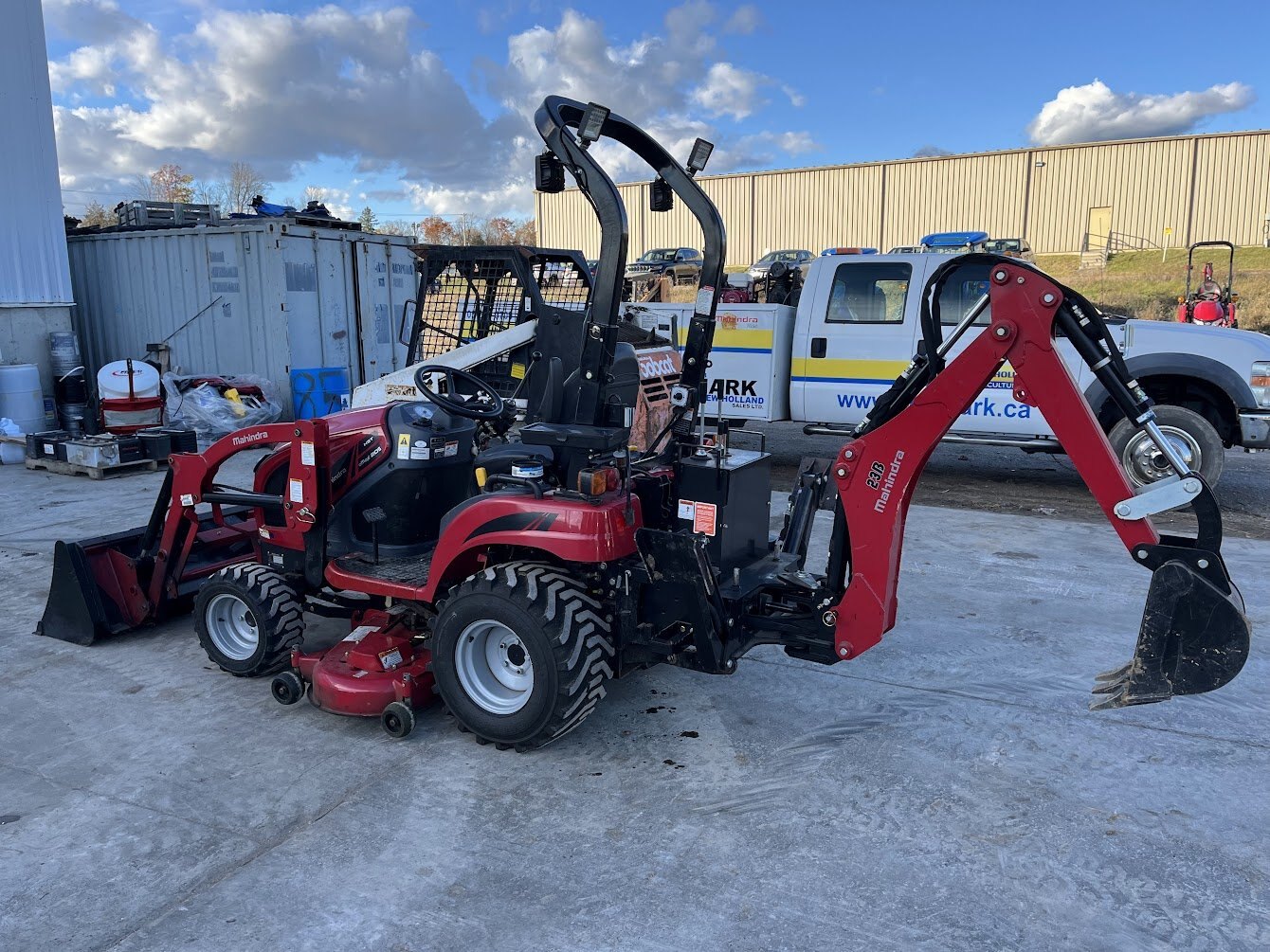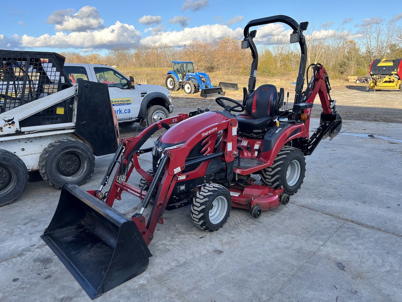 2019 Mahindra eMax 20S tractor loader backhoe & mid-mount mower deck, 19.4 engine horsepower, 14.2 pto horsepower, Four wheel drive, 2-range Hydrostatic transmission, R4 Industrial tires, Mahindra 23L loader with universal skidsteer quick-attach, Mahindra 23B backhoe, Mahindra 50M 54 inch mid-mount mower deck, Folding roll bar, 900 hours, Powertrain Warranty till November 15 of 2026, COMING