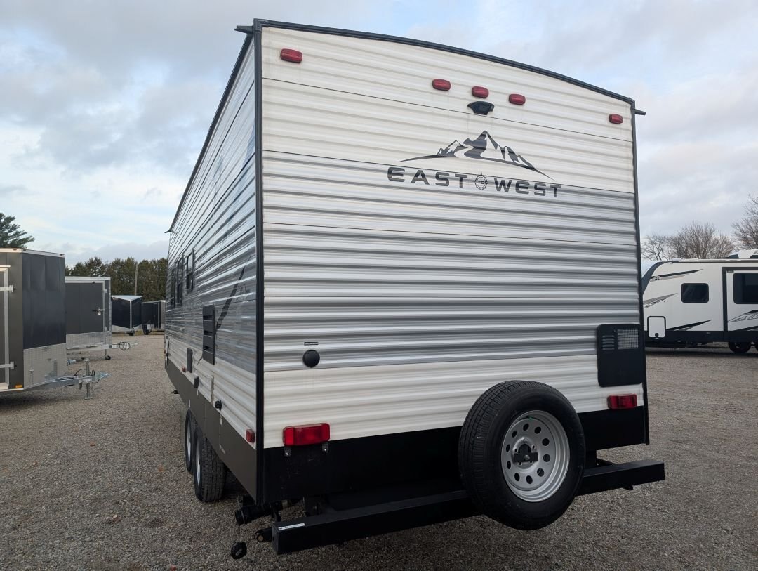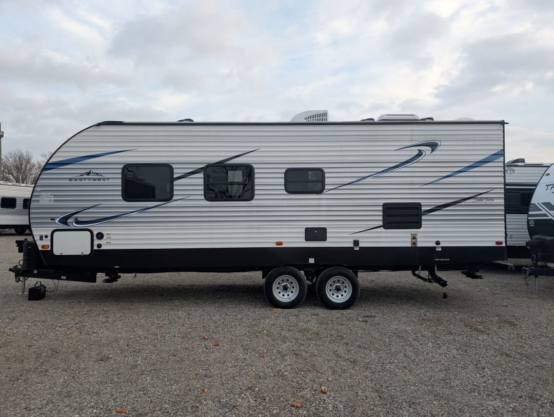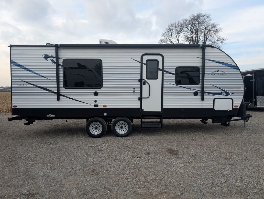 Looking for a clean, spacious, lightweight travel trailer that’s perfect for couples or small families? This 2020 East to West Della Terra 25KRB delivers comfort, storage, and build quality that’s hard to beat. Ideal for weekend getaways, seasonal camping, or full-time travel. FINANCING AVAILABLE FOR AS LOW AS $33/WEEK OAC. • Year / Make / Model: 2020 East to West Della Terra 25KRB • Towable / Weight: Dry weight ~ 4,973 lb • Length: 28 ft 1 in • Sleeping Capacity: Sleeps ~5 — private bedroom \ additional space • Interior Height: 81? ceiling gives a spacious feel • Fresh / Grey / Black Water Tanks: 51 / 40 / 40 gal • King-Size Bed: 72? x 80? plus storage under the bed • Kitchen: Full galley with 3-burner range \ oven, microwave, stainless undermount farmhouse sink, designer countertops, and pantry • Interior Finishes: Mortise & tenon shaker-style cabinets, roller-guided storage drawers, solid privacy door for the bedroom • Entertainment / Connectivity: Cable / satellite prep, USB charging stations, stereo system with exterior speakers • Climate Control: 15,000 BTU AC \ 30,000 BTU furnace • Bathroom: Rear bathroom with ABS tub surround, vanity sink, medicine cabinet, foot-flush toilet • Storage & Build Quality: Fully finished pass-through storage, 2? x 3? floor joists, automotive-coated frame, diamond plate rock guard, heated underbelly • Convenience Features: Power tongue jack, stabilizer jacks, tinted safety glass windows, LED lighting, universal docking station • Safety: Smoke, CO, and LP detectors, fire extinguisher, electric brakes on all wheels • Extras: Solar prep, exterior LP quick-connect, swing-arm entry assist handle