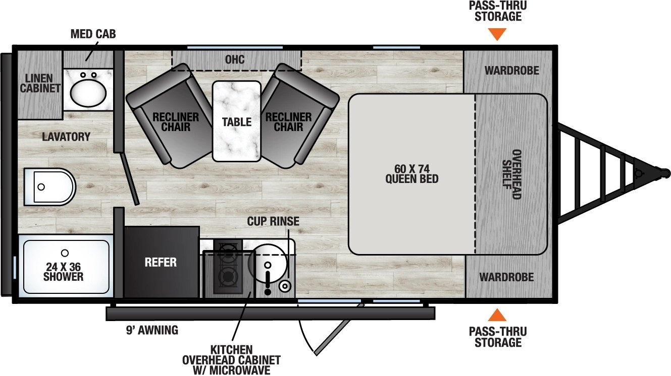 | This 18FQ is the first single axle conventional travel trailer to feature a 3-person jack-knife sofa, 2 euro-recliner swivel chairs, 2 separate table locations, a full trailer-width bathroom, and a north/south walk-around murphy bed with hidden corner storage… all in a single axle travel trailer. #CampEasy |