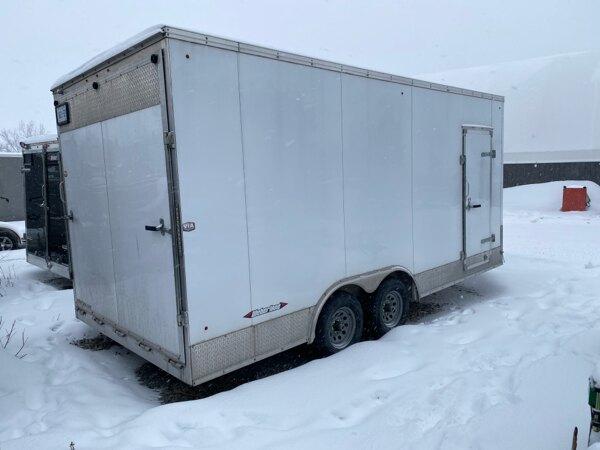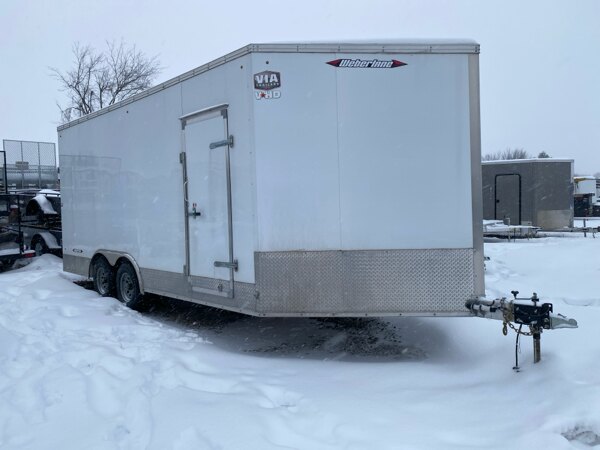 Externalspecs: 2021 Weberlane W8518ACTW All Aluminum Cargo Trailer,\n8.5\' x 18\' x 5\' vnose, 94\" interior heright, ramp,\n5200lbs tandem axles, ,curbside man door, diamond plate\next., e track on floor, spare tire.