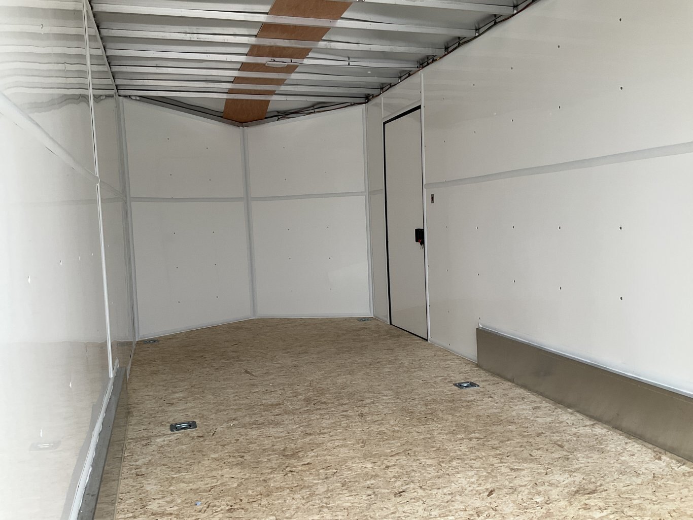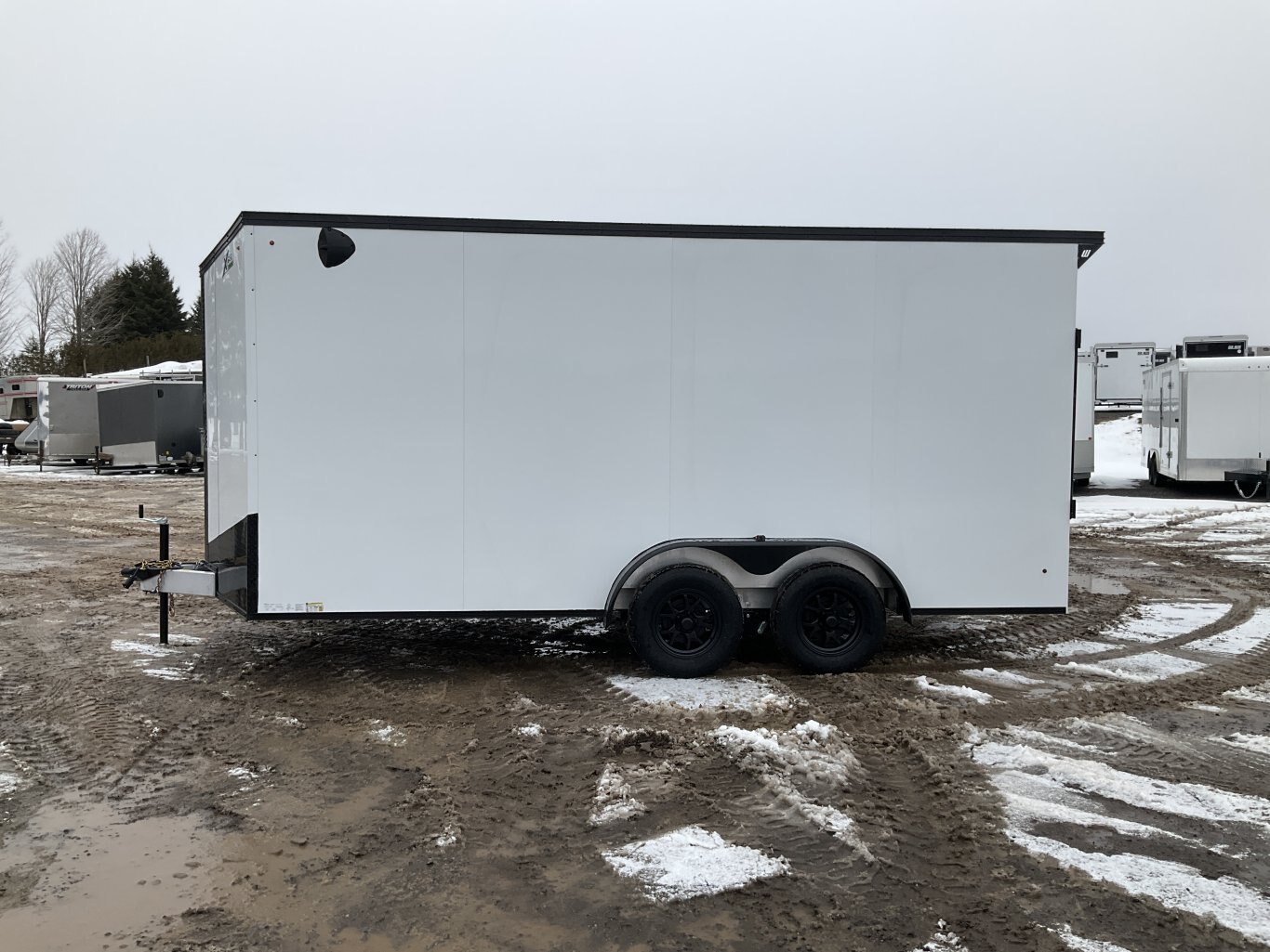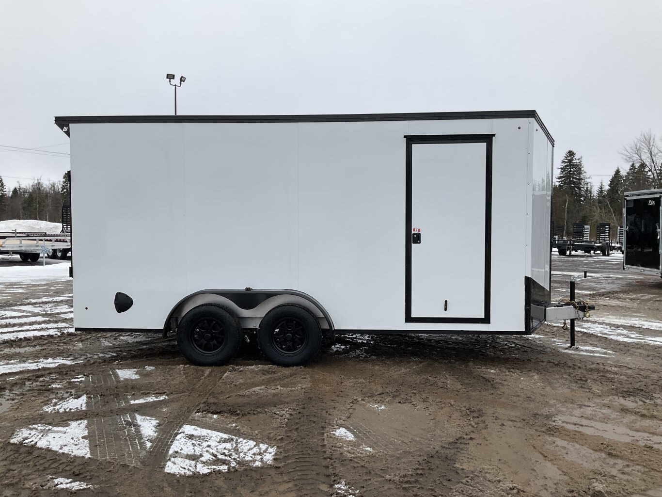 7000LB GVWR, 2 3500LB Spring Drop Axles with EZ Lube Hubs, Electric Brakes on Both Axles, 15" Radial Tires, Aluminum Rim Upgrade, 2' Sloped V-Nose, 7' Tall, .030 White Screwless Exterior with Blackout Package, 32" Side Man Door, Rear Ramp Door with Transition Flap and Spring Assist, 1/4" White Lauan Walls, 3/4" Rainblock Wood Floor, Seamless Aluminum Roof, 16" On Centre Walls/Floor/Roof, 2 Wall Vents, 12V Dome Light and Switch, 6 HD D-Ring Tie Downs, ATP Stone Guard, 2-5/16 Coupler, A-Frame Tongue Jack with Sand Pad, Rear Spoiler with Integrated Lights, Sealed LED Lighting