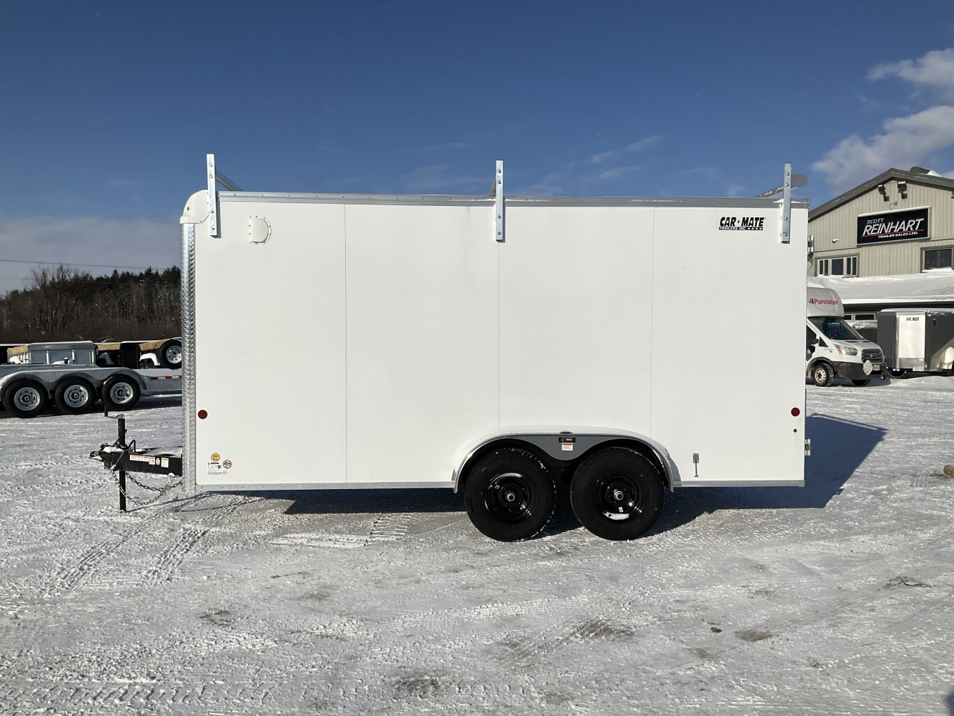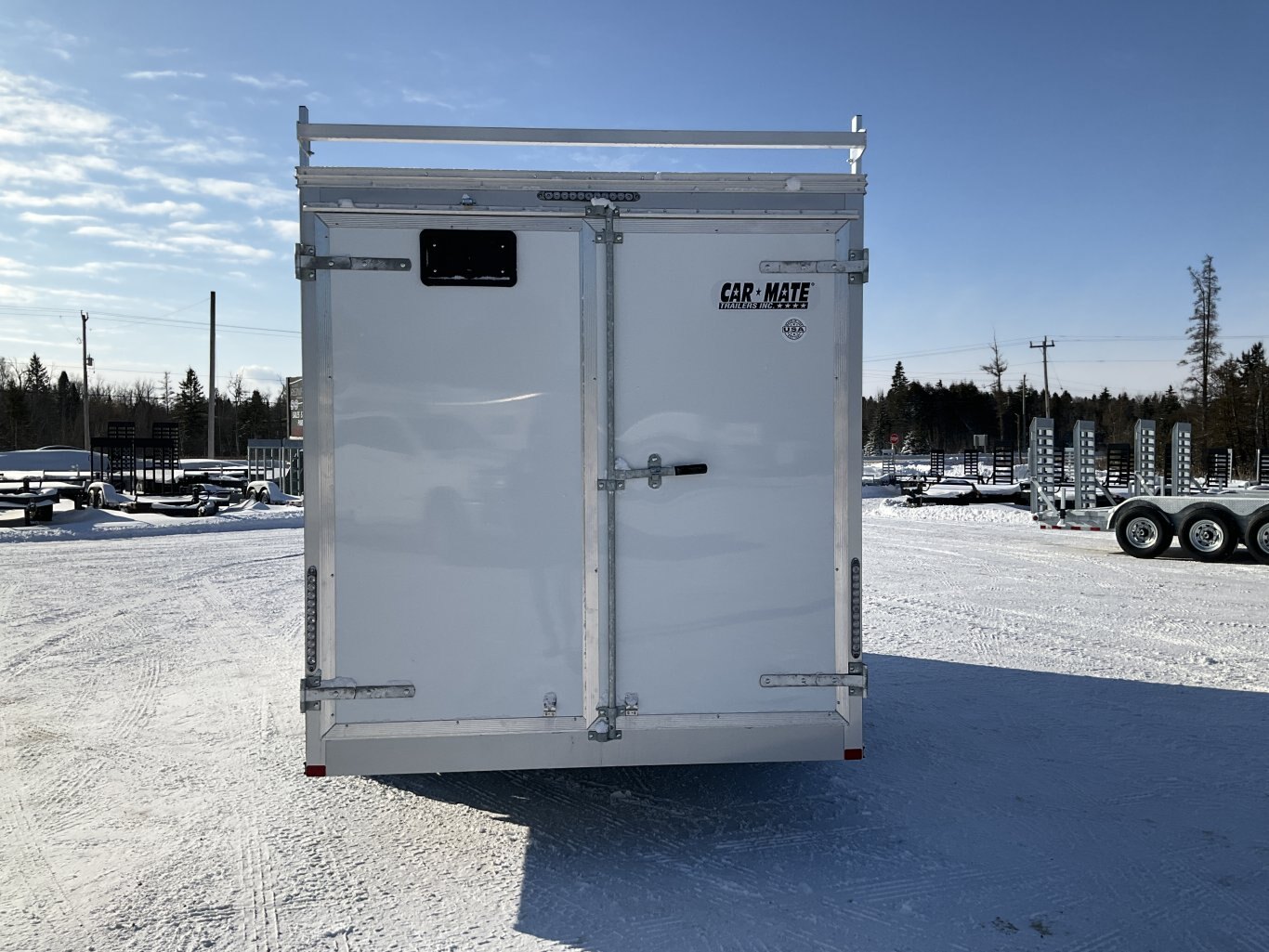 9990LB GVWR, 2 6000LB Torflex Axles, Electric Brakes on Both Axles, 15" Radial Tires, .030" White Screwless Exterior, Side Man Door, Double Rear Doors, 1/4" Plywood Walls, 3/4" Painted Plywood Floor, 16" On Centre Floor, 24" ATP Stone Guard, Triple A Frame, A-Frame Tongue Jack with Sand Pad, LED Exterior Lighting, Contractor Package Including: 82" Tall to Square, Reinforced Flat Roof, 2 Wall Vents, 2 12V LED Dome Lights with Switch, 110V 15 AMP Inlet Receptacle, 11-V Duplex Wall Receptacle, Ladder On Front with APT Drawbars, 3 Aluminum Ladder Racks