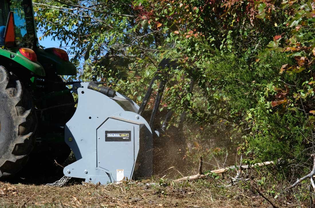 Our 500 series fixed tooth masticating head brush mulchers for 3-point hitch tractors are designed to maintain and clear fence lines on farms and entry level contractor work. The 500 series Baumalight brush mulchers will efficiently mulch heavy brush and small trees and are offered with two different types of teeth. The Planer style teeth take small bites and provide the most efficient mulching and cutting. The Ripper style teeth have more of a shredding mulching action. Their v-shaped design makes them less susceptible to impacts with hard objects like stones, making them the better choice when mulching below grade and in fence lines.