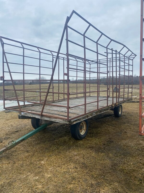 20\' Thrower rack, metal side, wood bottom\non Martin 10 ton wagon with 11Lx15 tires