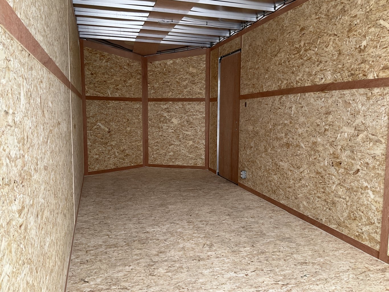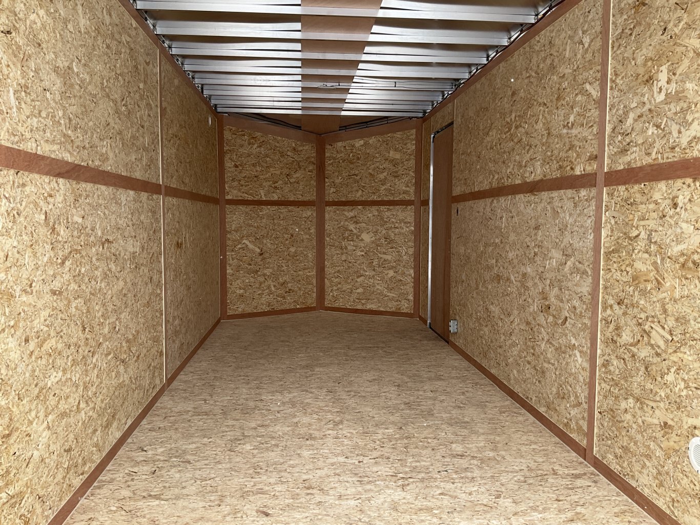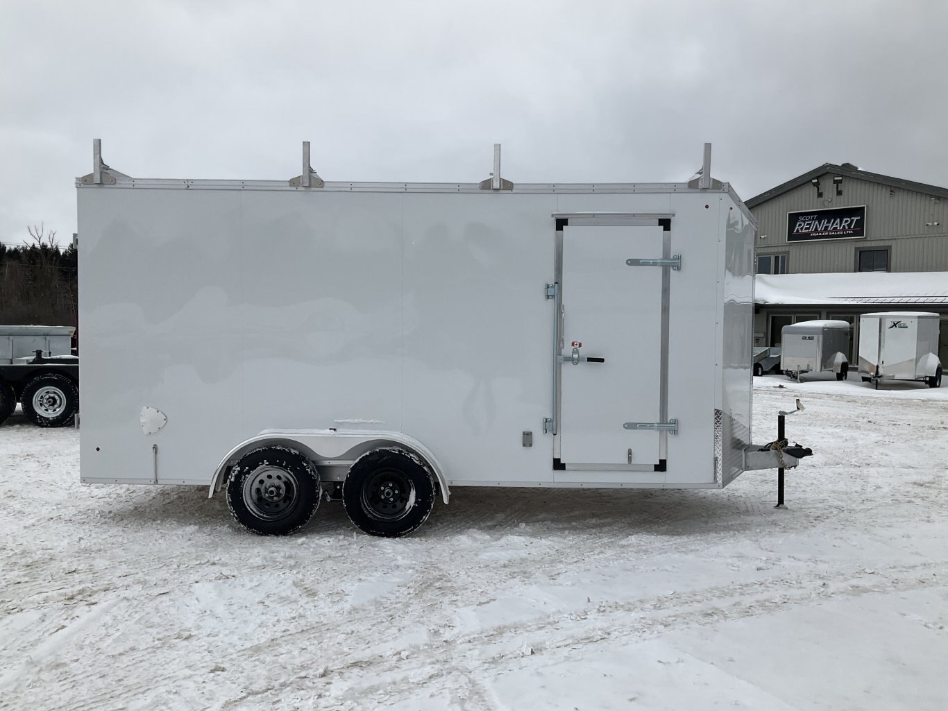 7000LB GVWR, 2 3500LB Spring Drop Axle with EZ Lube Hubs, Electric Brakes, 15 Inch Radial Tires, Electric Brakes on Both Axles, 2' Sloped V-Nose, 7' Tall, .030 White Screwless Exterior, 32" Side Man Door, Double Rear Doors, 3/8" Wood Lined Walls, 3/4" Marine Rainblock Wood Floor, Seamless Aluminum Roof, 16" On Centre Walls/Floor/Roof, 2 Wall Vents, 12V Dome Light and Switch, 4 Aluminum Ladder Racks, 110V Inlet and Duplex Receptacle, ATP Stone Guard, 2-5/16" Ball Coupler, A-Frame Tongue Jack with Sand Pad, Sealed LED Lighting