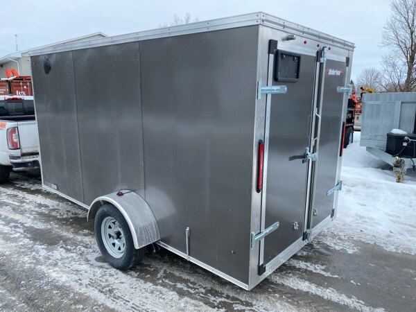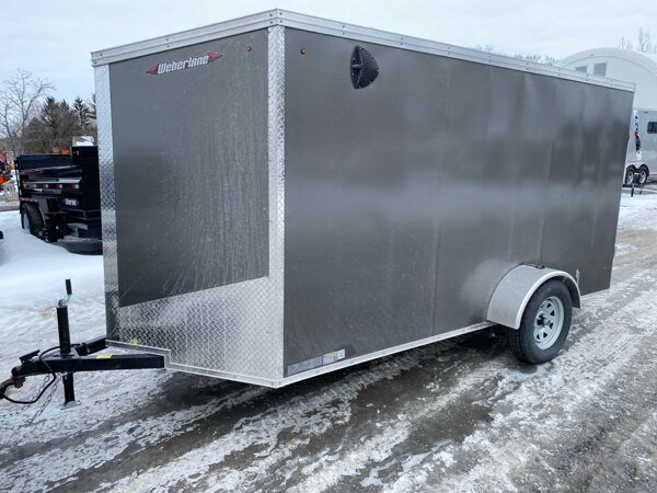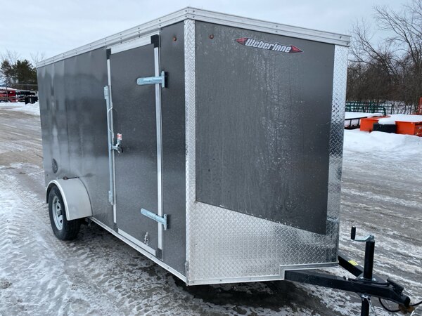 Externalspecs: 2026 Grey Weberlane W612ECSW Cargo Trailer, steel frame,\n6\' wide x12\' long, wedge nose, 32\" side door, rear barn\ndoors, 16\" side z post c-c, 24\" floor cross, 24 roof\ncenters, single 3500 drop axle, 205x15x5 bolt wheels\nupgraded to galvanized wheel per axle, 2-ball coupler,\njack, led lights, 1-1/2 trim level, 3/4 rainblock floor/\n1/4\" sides, aluminum 1 pc roof, screwless sides, 72\"\ninside height, pare of side vents trop front and lower\nrear