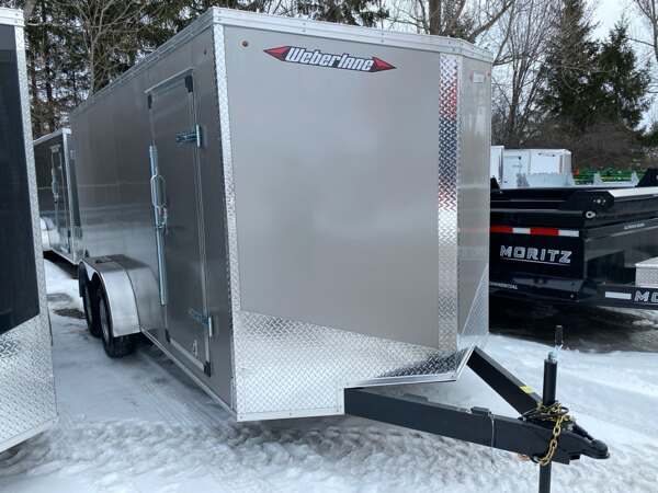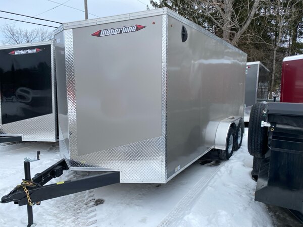 Externalspecs: Pewter Steel Frame Cargo Trailer, 7\'x16\', wedge nose,\n32\" side door, HD rear ramp door w/ spring assist 7\',\n16\" side tube post c-c, 16\" floor cross, 16 roof\ncenters, tandem 5200 drop axles, Electric brake per\naxle, 205x15x5 bolt wheels upgraded to galvanized\nwheels per axle, 2-5/16 ball coupler, jack, led lights,\n3/4 rianblock floor/ 3/8\" sides, aluminum pc roof - flat\nroof system, screwless sides, 78\"height, extended tongue\npair of side vents- top front and lower rear