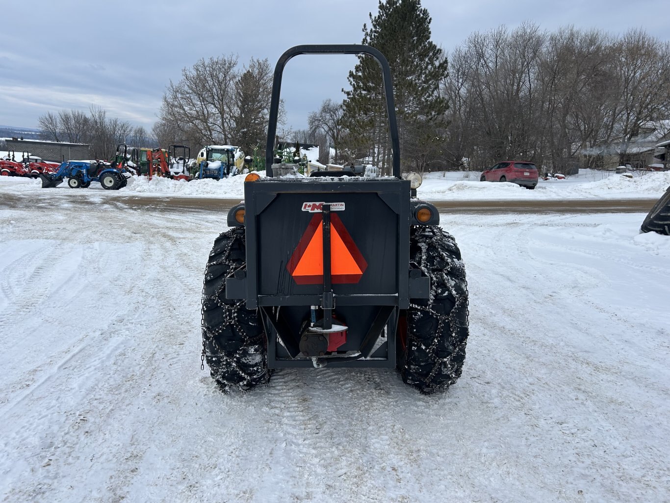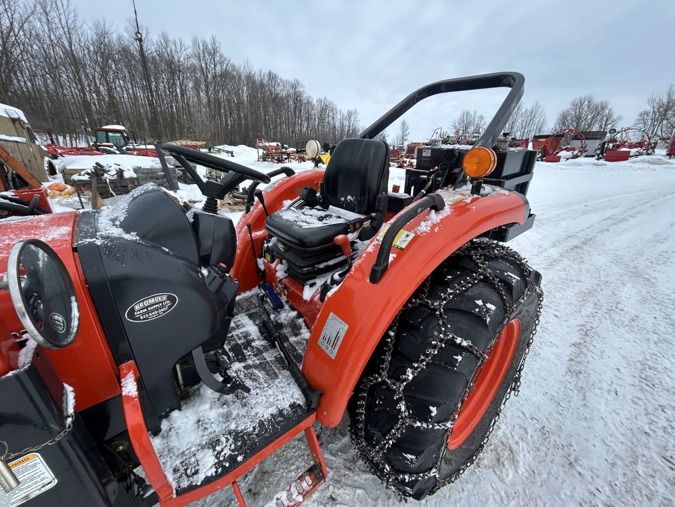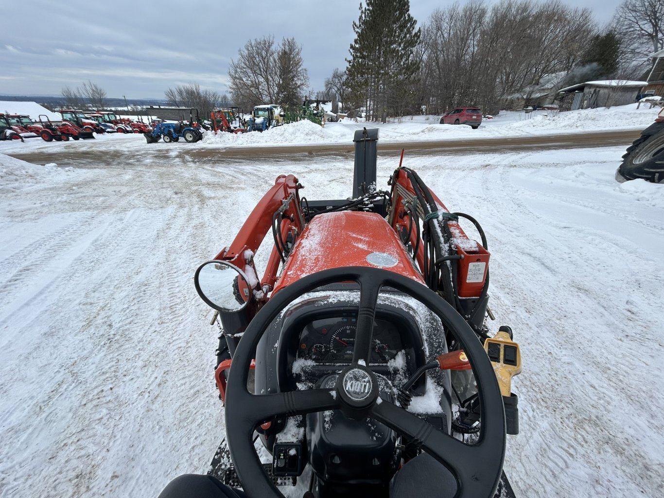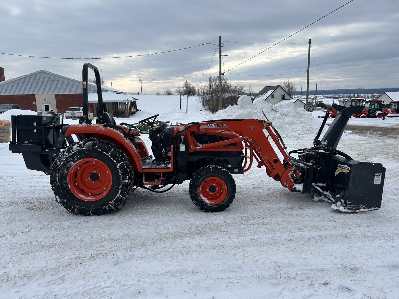 Kioti DK45SE HST 4WD with Kioti KL401 loader. Machine has high medium and low ranges, 1 set of rear remotes, rear tire chains, loaded rear tires, tilt steering, toolbox, and more. Recently checked over by one of our mechanics and is ready to go!