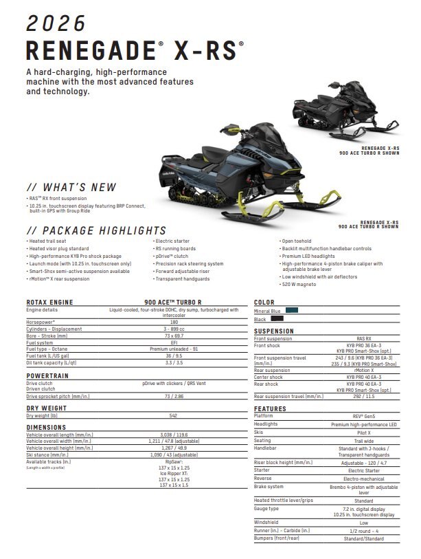 2026 Ski-Doo Renegade X-RS 900 ACE Turbo R Ice Ripper XT 1.5" E.S. w/ 10.25" Touchscreen DEMO