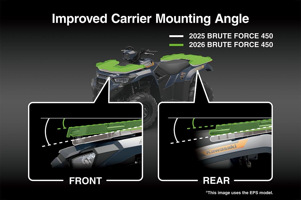 | Energize work and play on the Brute Force 450 ATV. Powerful, nimble, and stacked with utility features, no other mid-size ATV gives you more. Tackle demanding chores capably, while enjoying unique sporty performance that can only be delivered by Kawasaki. Strong build quality pairs with aggressive style for a durable ride that never fails to excite. No matter the task the Brute Force 450 ATV is built for you. When you need more capability, the new Brute Force 450 (EPS) ATV steps up. Speed-sensitive EPS delivers sporty, confident handling, while front and rear steel cargo racks with plastic cargo rack covers, integrated KQR mounts, tie-down points, and bucket-retainer grooves ensure quick, secure loading. |