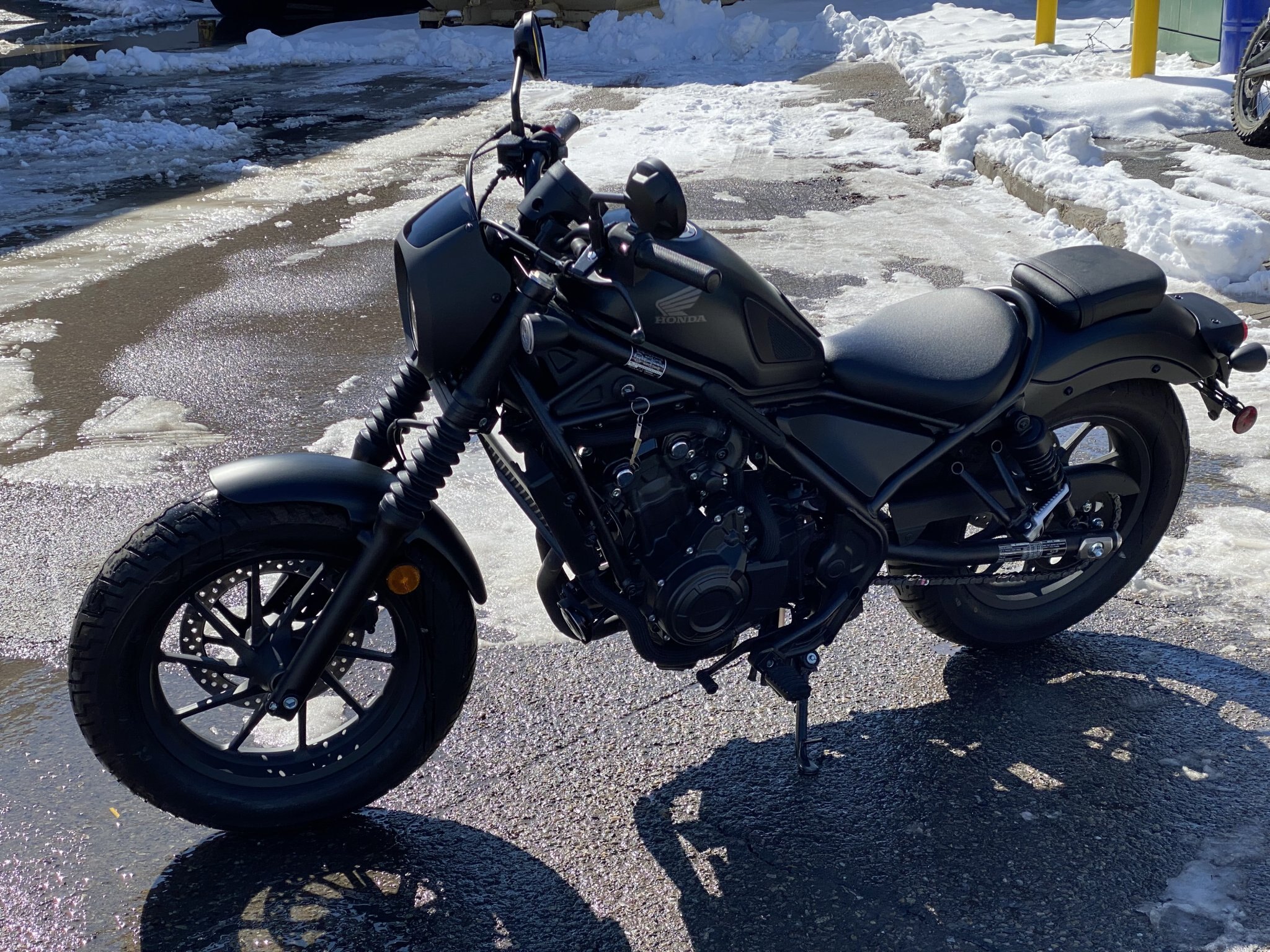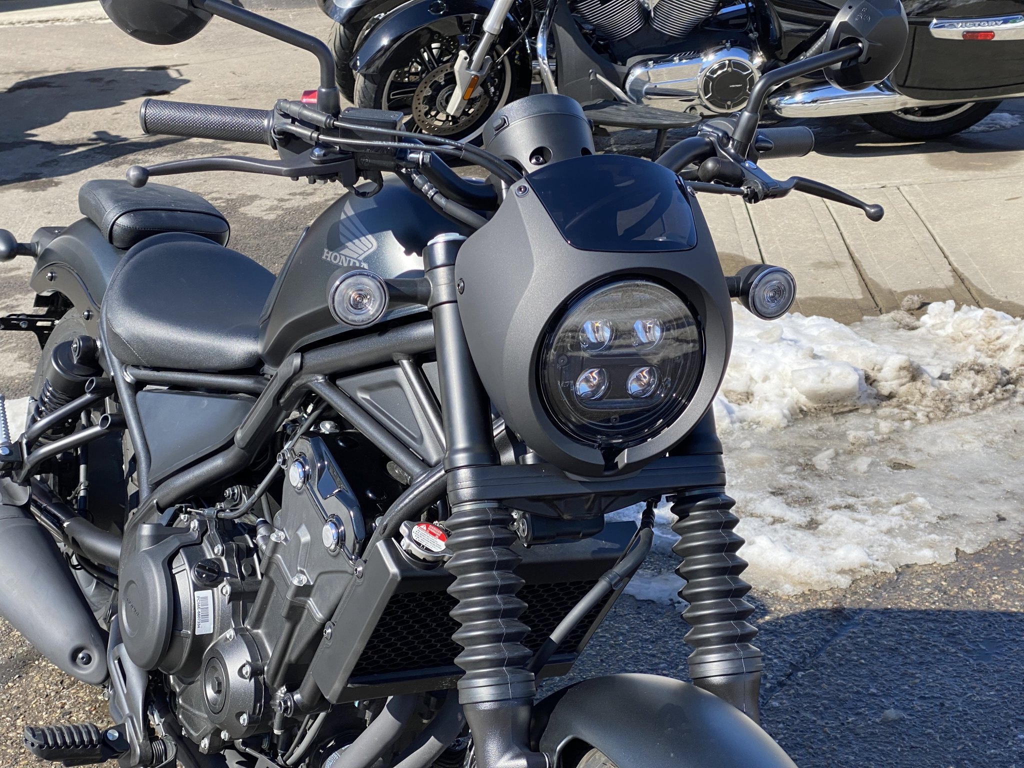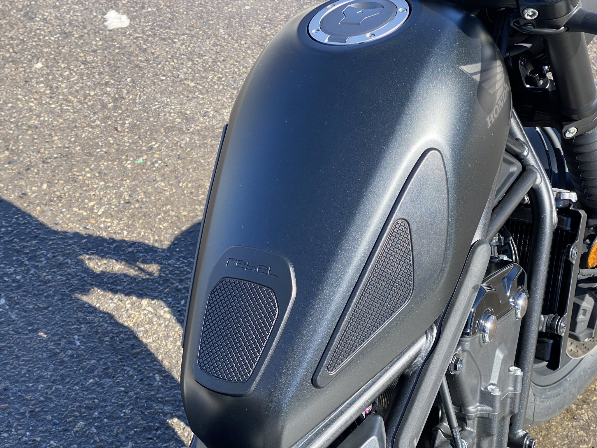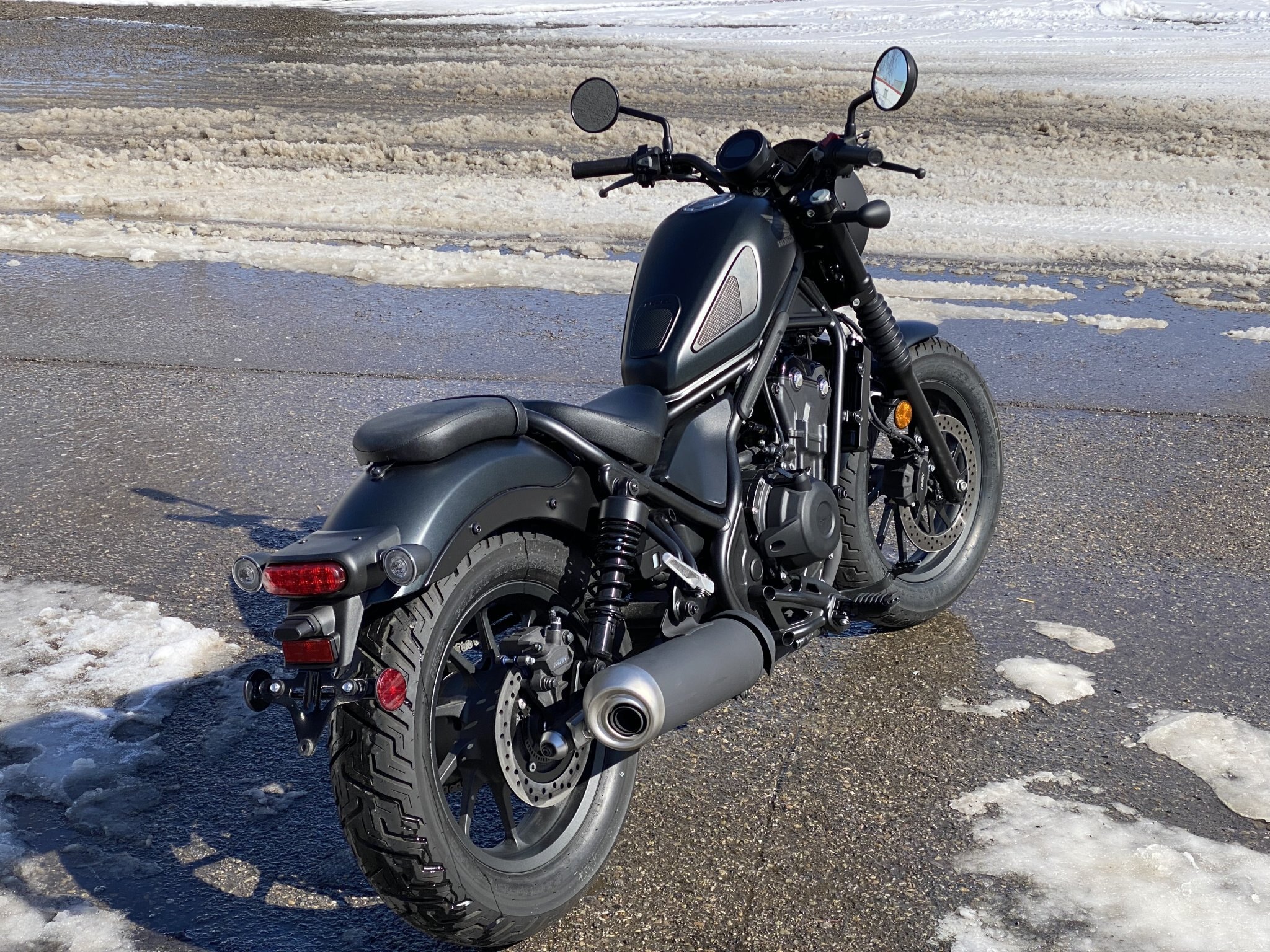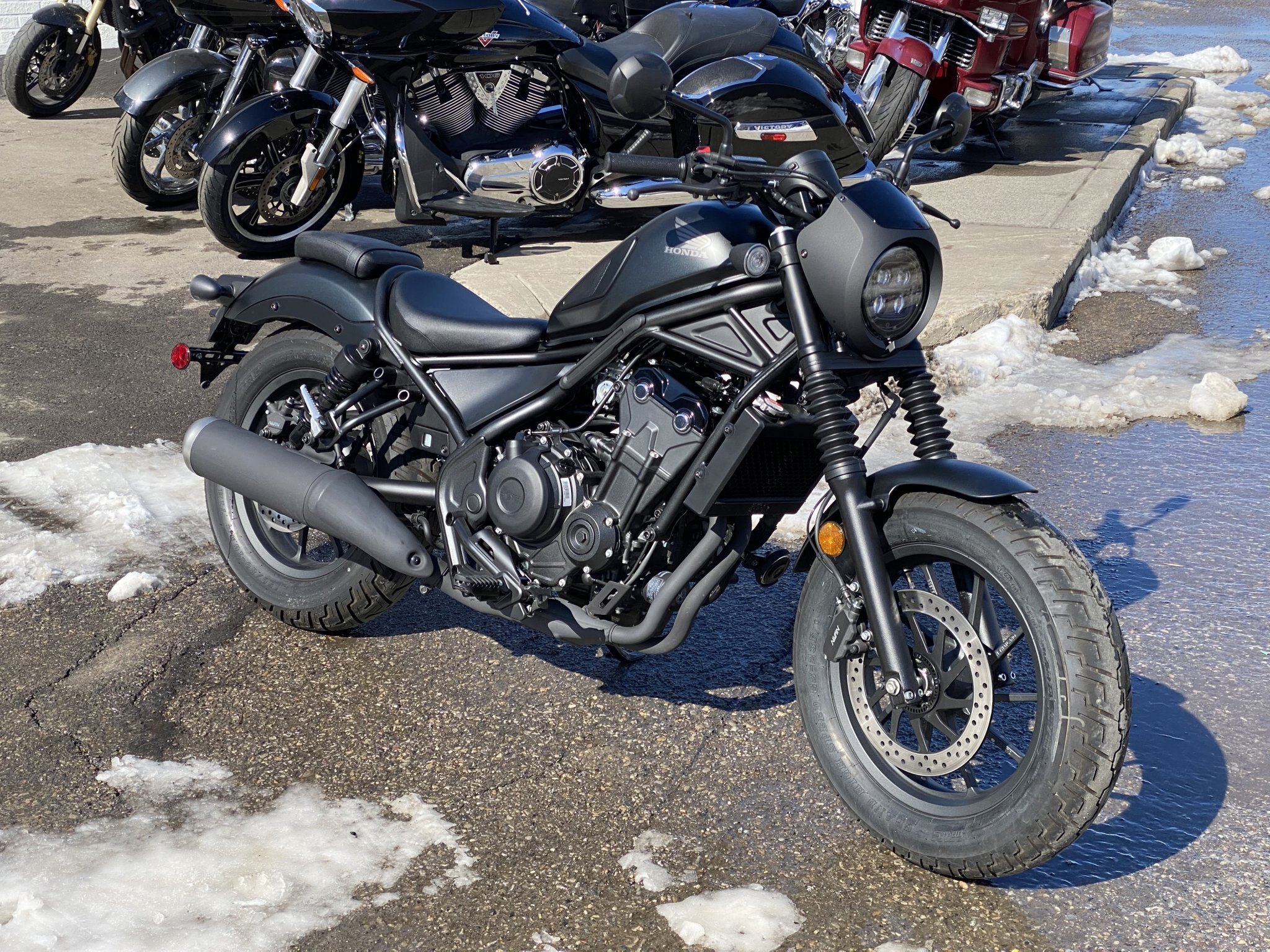 The 2025 Honda Rebel 500 ABS SE (Special Edition) is a cruiser motorcycle featuring a 471cc liquid-cooled parallel-twin engine, characterized by a low 27.2-inch seat height and "blacked-out" styling. The Special Edition adds factory-installed accessories, including a brown diamond-stitch seat, black fork boots, and a colour-matched headlight cowl.