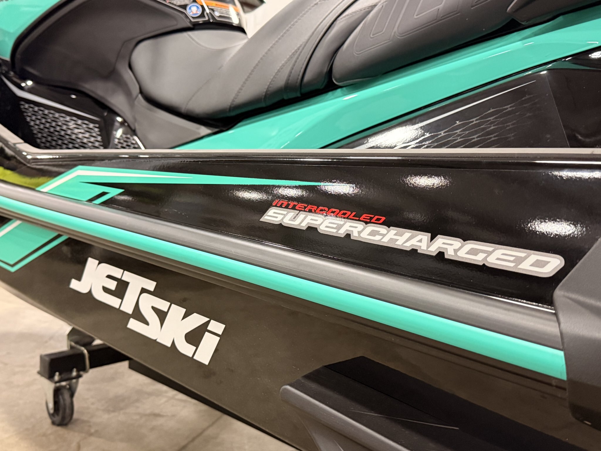 This high-contrast color combination pairs deep, rich black tones with vibrant turquoise accents, creating a sharp, modern look with excellent depth and visibility on the water. The finish is designed to highlight the aggressive lines of the hull while maintaining a clean, upscale appearance.