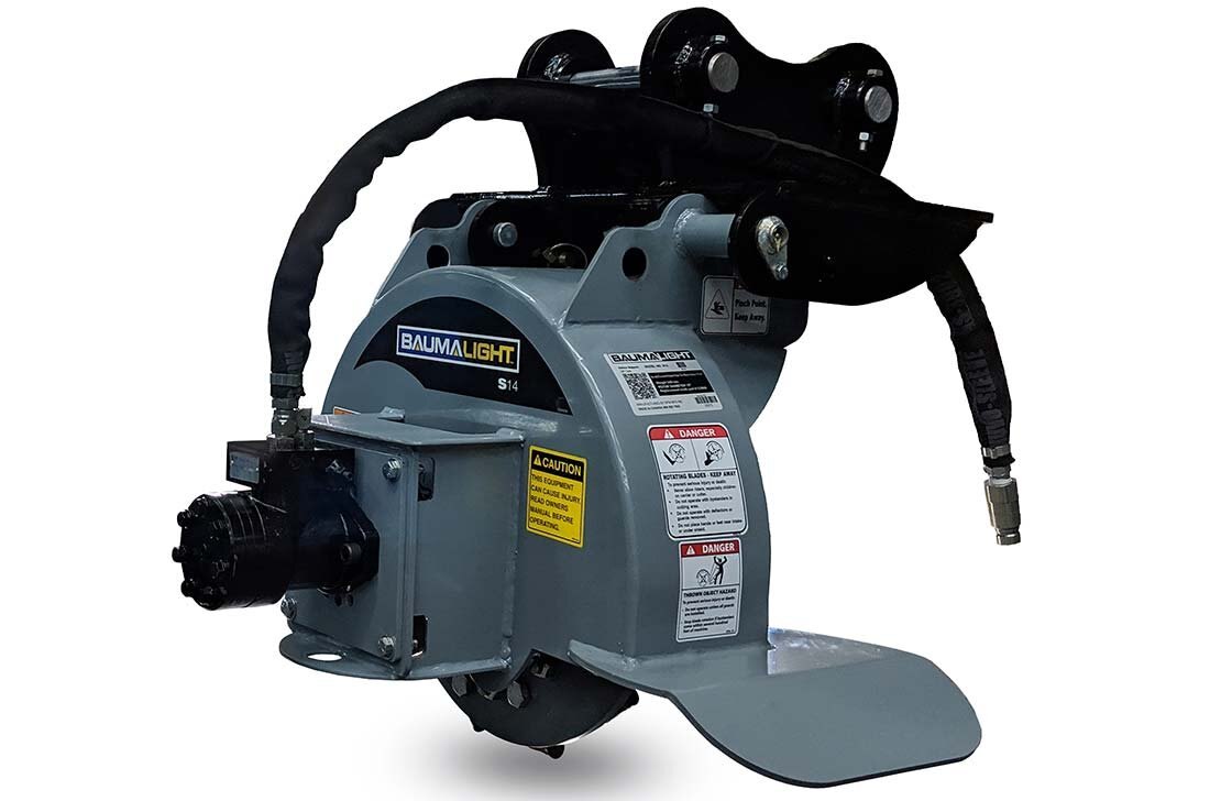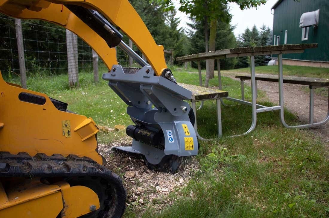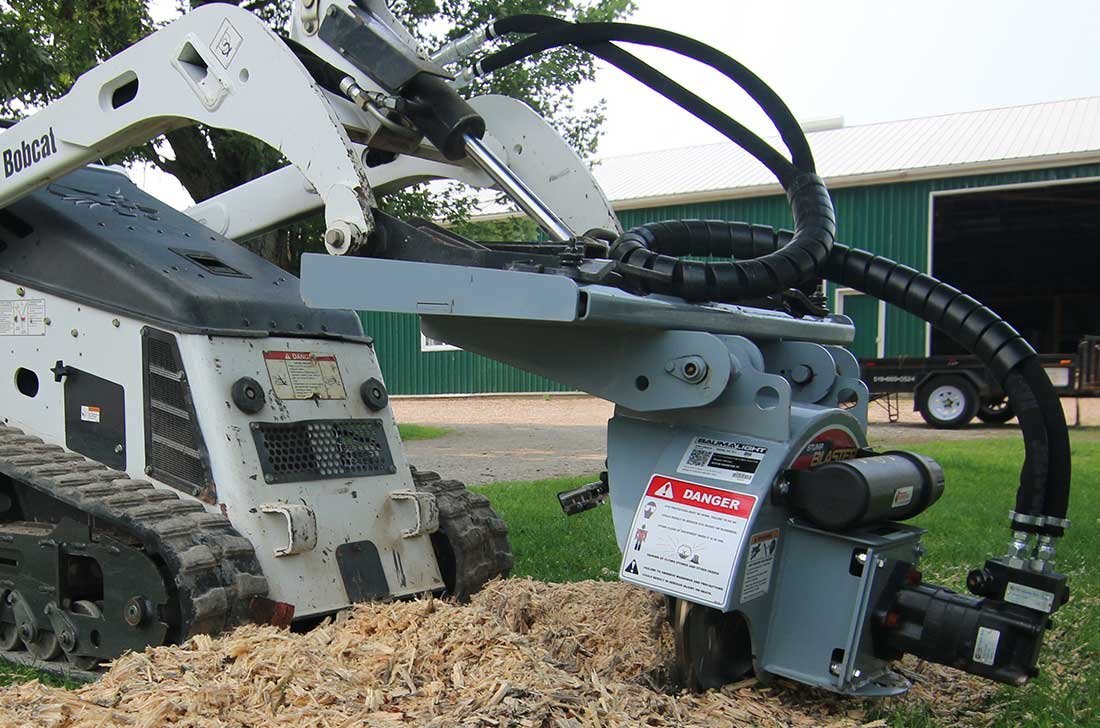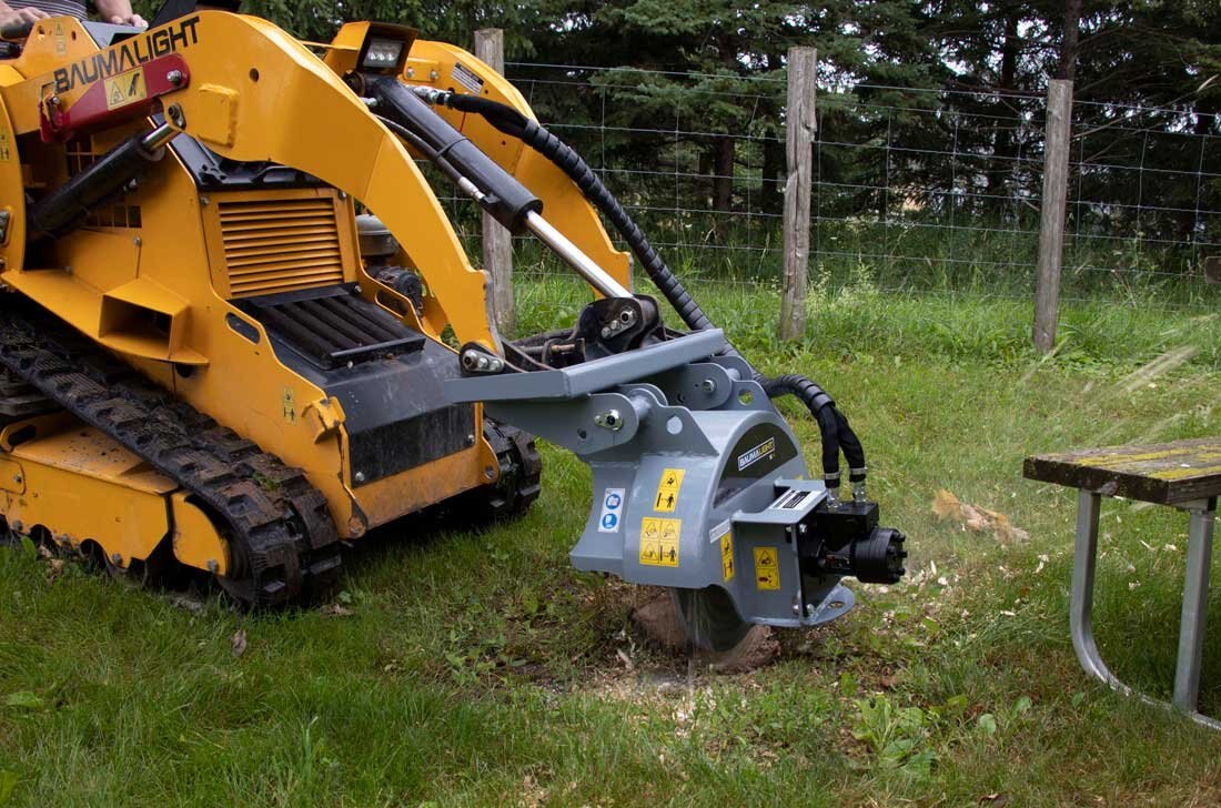 The S14 skid steer stump grinder is designed with simple operation in mind, with no required electrical connection. The direct flow hydraulic drive is designed to provide the best torque and RPM to the cutting head as no flow is diverted to a swing cylinder. The S14 mini tool carrier stump grinder features round carbide teeth which can be rotated three times, letting you grind stumps longer and faster on very low flow. The unique positioning of the rotor allows the operator an excellent view of the grinding action and the heavy duty fixed deflector safely directs the flow of debris. Cutting depth is up to 10" below ground. The S14’s size and the available mini skid steer mount makes it a great stump grinder for better access to tight areas and a nice addition to the rental offering on a mini skidsteer.