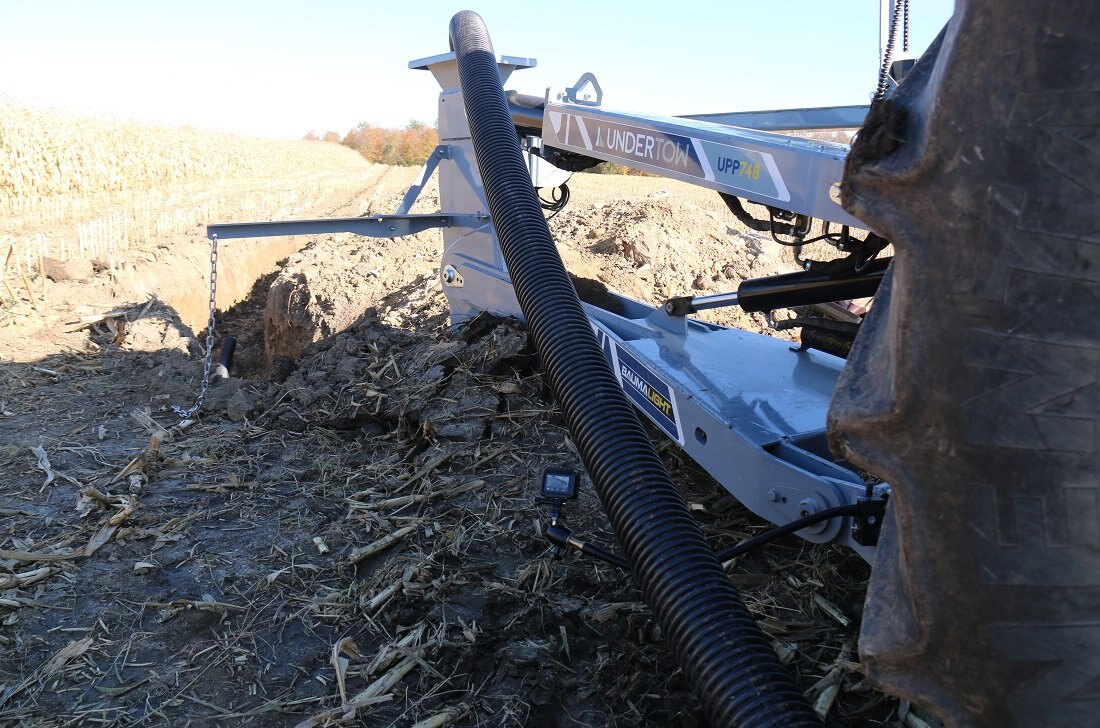 The UPP748 3-Point Hitch model offers the option of using a smaller tractor to lay drainage tiles up to 4 ft deep. The double linkage will help keep pressure on your front wheels as the top link pushes back on the shank. There is a manual override on the mast to offset the laser beam if needed and in cab digital controlling to make sure all your tiles are angled down. Includes a standard 4” boot and laser controls.