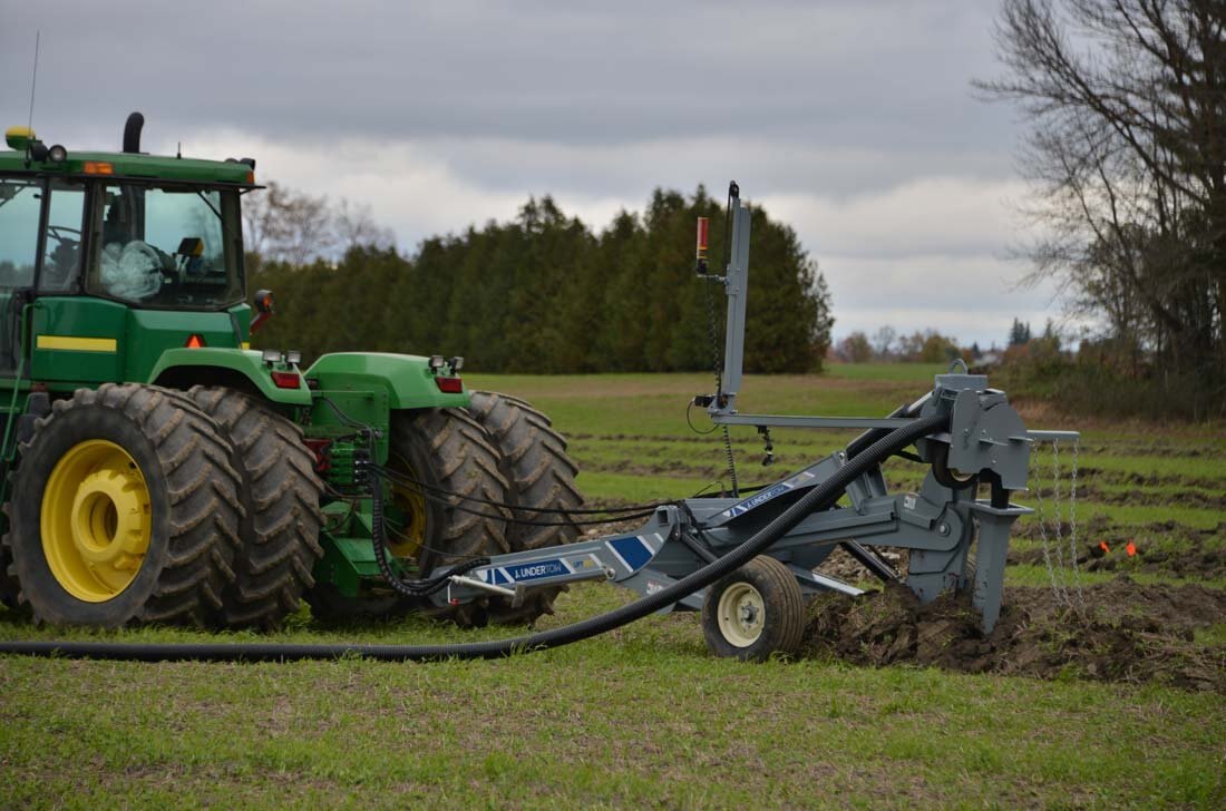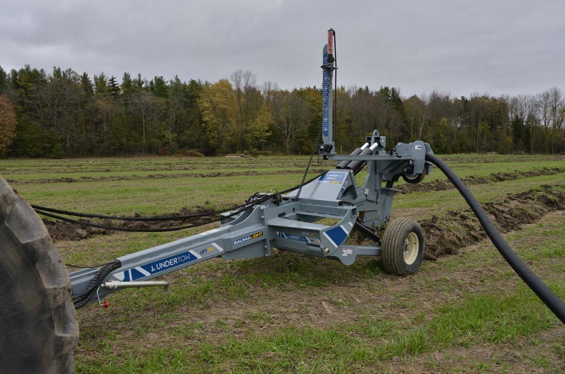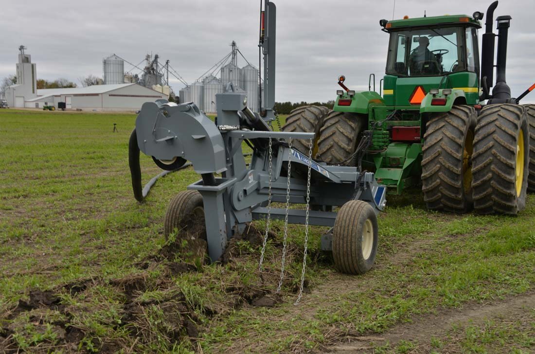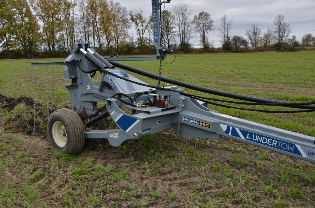 For bulldozers, hooking up to the Undertow's Draw Bar Plow model is fast and easy and is set up to lay drainage tiles up to 5 ft deep. There is a manual override on the mast to offset the laser beam if needed and in cab digital controlling to make sure all your tiles are angled down. Includes a 4” & 6” boot and laser controls.